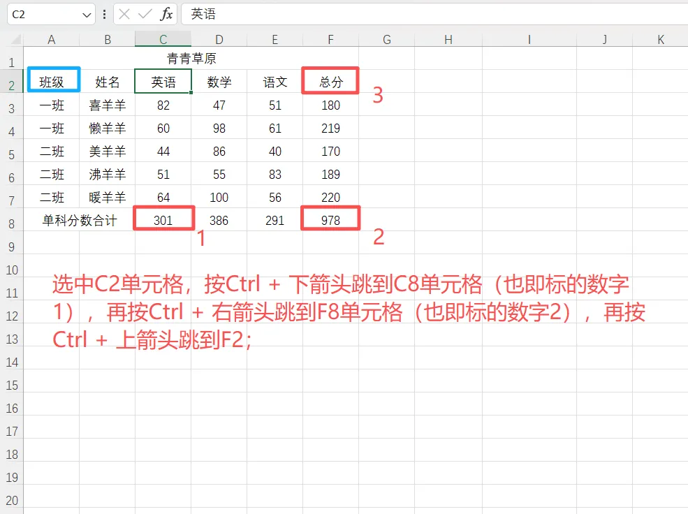 2、Ctrl + 向上/下/左/右箭头键:快速跳转到数据区域边界;数据太多时,可通过这个方式来快速跳转到数据边界(如最后一行、最左一列等),注意:若数据中有空格,会跳转到该方向空格的上一单元格。