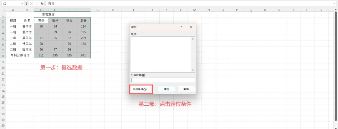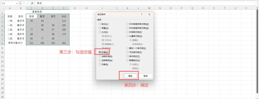 4、选择空值:选中数据→Ctrl + G打开定位→定位条件→空值;
