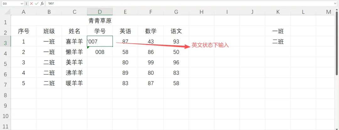 为什么输入的是007,而显示的却是7呢?之前在单元格格式自定义有提到哦,今天说一个不设置格式也能显示007的方法,那就是在输入前加一个英文状态下的 ' ;