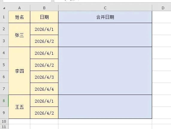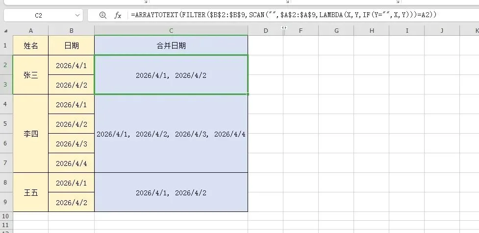 小伙伴们,今天继续我们的函数实战系列,今天我们更新到第16期。现有AB列数据,现需对B列日期根据A列姓名进行合并。还是合并单元格的问题,如果没有合并单元格,那问题就更简单了。我们可以用多种方法把A列按合并单元格填充姓名,我们还用SCAN函数,已经习惯新函数了。然后用FILTER函数筛选符合条件的日期。用ARRAYTOTEXT函数转换成文本,当然用TEXTJOIN函数连接也是一样的。=ARRAYTOTEXT(FILTER($B$2:$B$9,SCAN("",$A$2:$A$9,LAMBDA(X,Y,IF(Y="",X,Y)))=A2))SCAN("",$A$2:$A$9,LAMBDA(X,Y,IF(Y="",X,Y)))SCAN函数在A2:A9中循环(Y),初始值为空,利用IF判断,循环得到结果。{"张三";"张三";"李四";"李四";"李四";"李四";"王五";"王五"}用FILTER函数筛选出符合条件的日期,用ARRAYTOTEXT函数转换成文本。需要注意的是,公式填充区域有合并单元格,输入时要注意,选住区域,输入公式,按CTRL+ENTER组合键结束。总体函数思路不难,写起来公式也不绕,有兴趣的小伙伴一定要练起来啊!