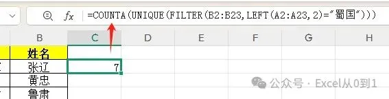 如何对A列包含蜀国的B列进行唯一计数?如下图所示: