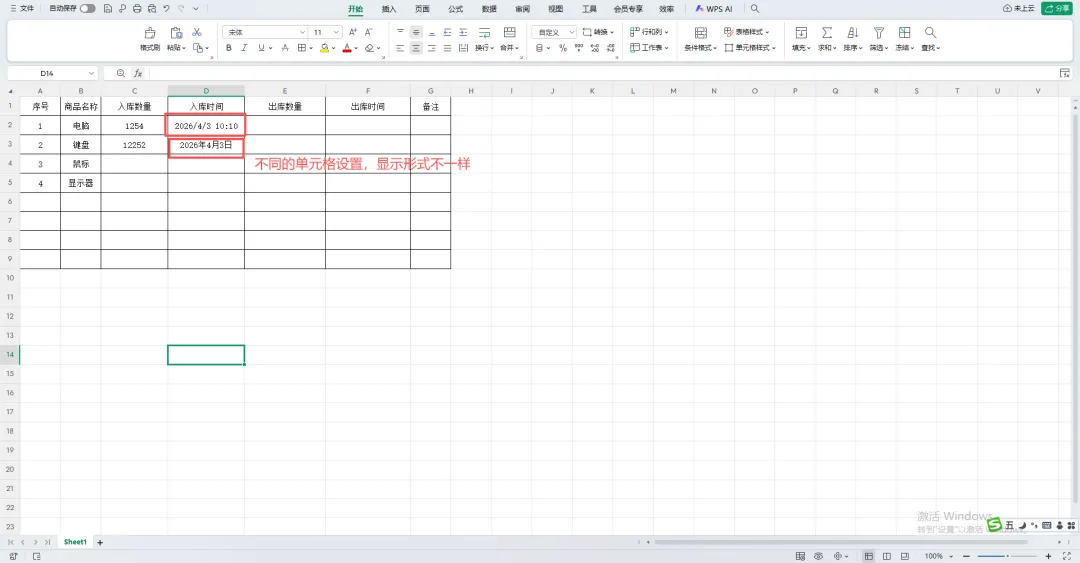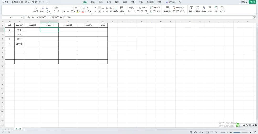在 D2 单元格(入库时间)输入以下公式: