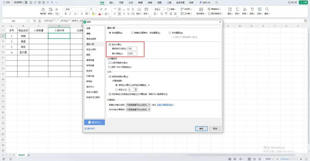 ✅ 注意:公式中出现了 循环引用(D2 引用自身),所以后续需要开启迭代计算。