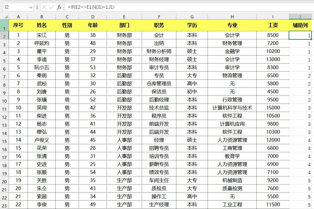 N(J1)+1:若内容不同,将 J1(上一行辅助列)的数值转为数字后 + 1(N 函数可避免 J1 为空或者文字时的报错,按 0 计算);