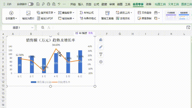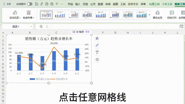 修改之前,图表元素是全的,但是大多人应该会觉得界面有些乱,还有些冗余。垂直坐标轴,主要是为了定位每个数据的位置,方便数据对比;而横向网格线,本质是坐标轴刻度的视觉延伸,也是为了辅助读数。在第一张图表中,我们已经将每个数据的数据标签展示了出来,而柱子的长短已经很直观地对比了数据之间的大小,这时候坐标轴和网格线的作用就已经冗余了,完全可以删除。网格线可好删除,鼠标随机点击一条网格线,摁delete键即可删除。垂直坐标轴,仅有左坐标轴或者右坐标轴时,也可选中后直接delete。但如果有左右两根坐标轴,直接delete会导致默认组合图两个系列共用一个坐标轴,导致生成如下结果:点击坐标轴,将文字颜色改为与图表背景色一致,然后将文字大小尽可能缩小,使得绘图区域尽可能充满图表。有问题留言区交流