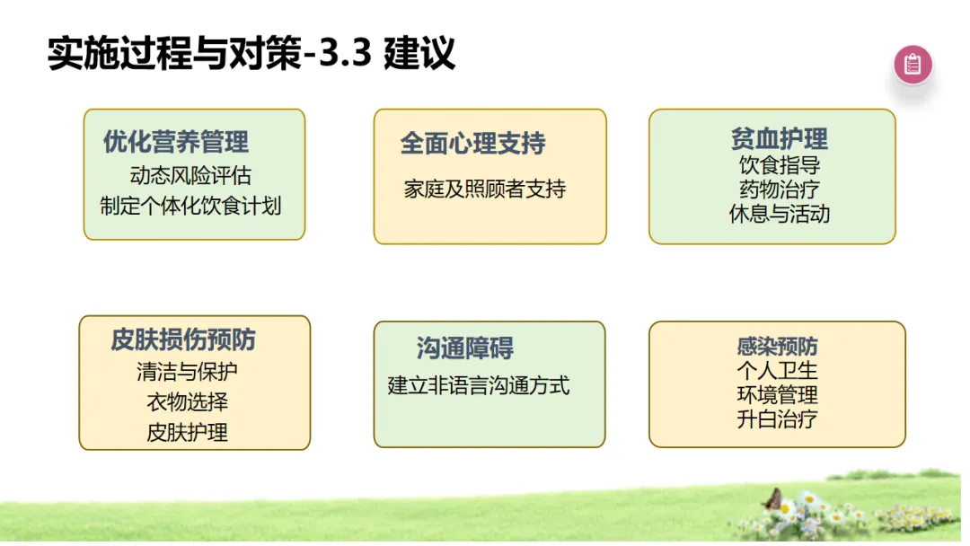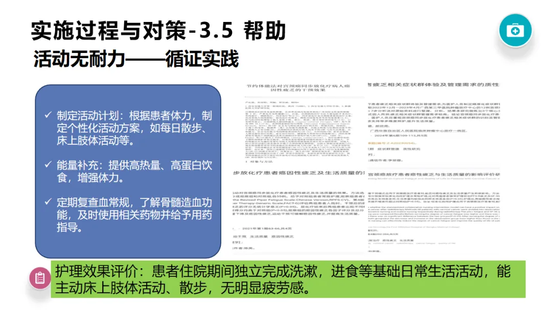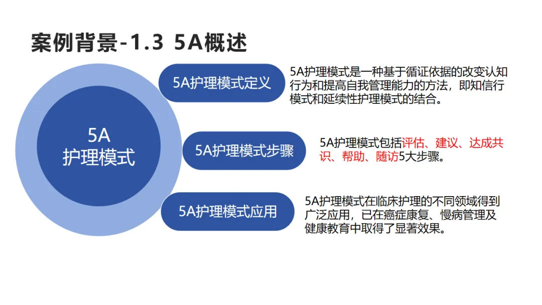 《"健康中国2030"规划纲要》强调疾病早诊早治与全程康复,5A护理模式作为循证护理与延续性护理结合的典范,以评估、建议、共识、协助、随访为闭环,可实现个体化、精准化护理干预,在肿瘤康复领域成效显著。