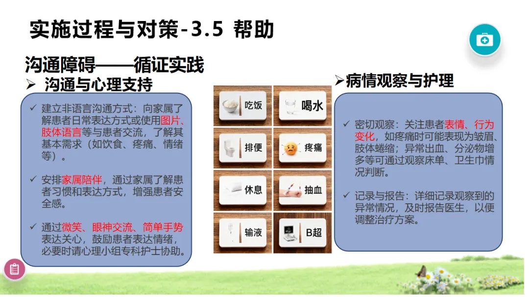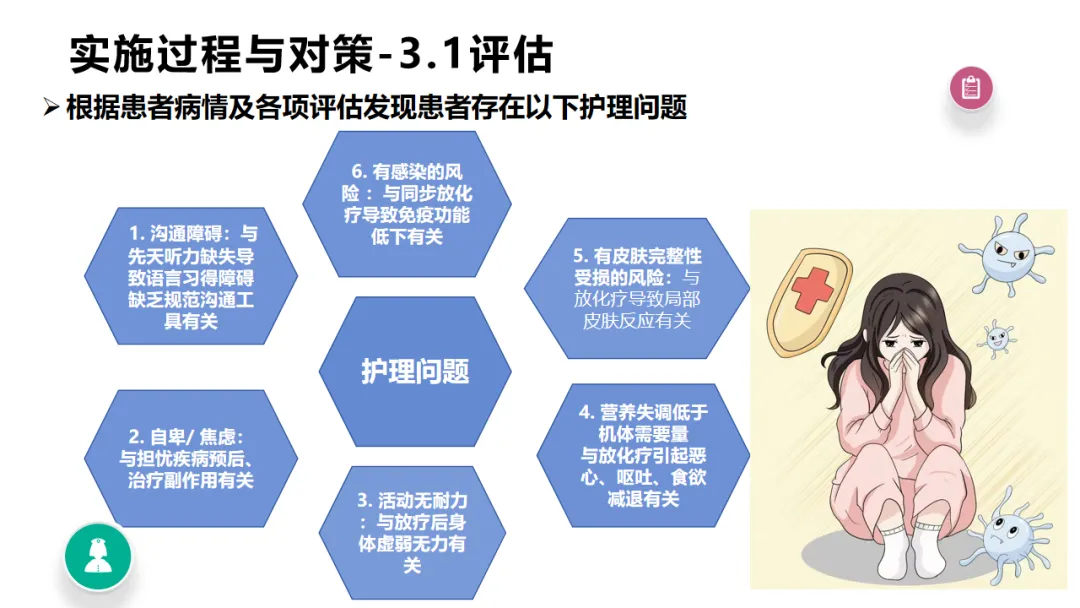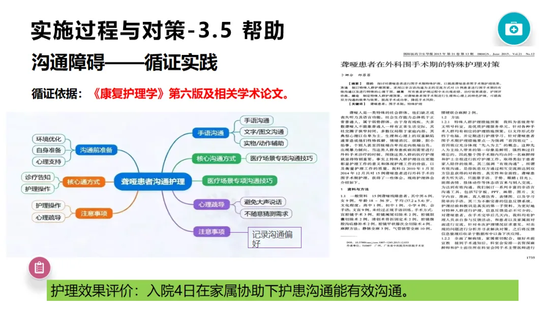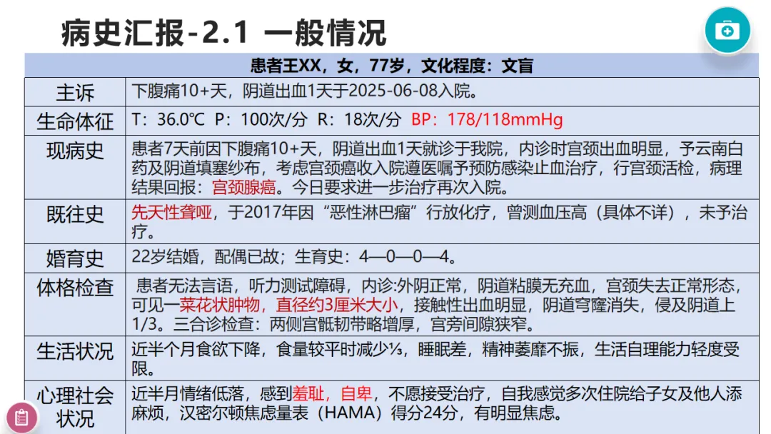 本案例以77岁宫颈癌ⅡB期聋哑患者为个案,依托5A护理模式,结合多学科协作,针对患者沟通障碍、放化疗不良反应、多种护理风险等问题,制定并实施循证护理对策,通过非语言沟通建立有效交流渠道,开展症状管理、心理疏导、并发症预防等全程干预。