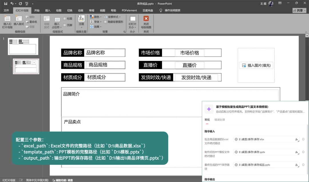# 使用此指令前,请确保安装必要的Python库:# pip install python-pptx pandas openpyxlimport pandas as pdfrom pptx import Presentationfrom pptx.util import Ptfrom typing import *try:from xbot.app.logging import trace as printexcept:from xbot import printdef generate_ppt_from_excel(excel_path: str, template_path: str, output_path: str) -> str:"""title: 基于模板批量生成商品PPTdescription: 自动匹配占位符并填充。支持特定字段("品牌简介"、"产品卖点")实现标题加粗+正文常规的富文本混合排版。inputs:- excel_path (str): 包含商品数据的Excel文件绝对路径- template_path (str): 制作好的PPT模板文件绝对路径- output_path (str): 最终生成的PPT保存路径outputs:- result_msg (str): 执行结果提示信息"""if template_path == output_path:raise Exception("【路径错误】输出路径不能和模板路径相同,否则会覆盖您的模板!")# 1. 读取并清洗Excel数据print(f"正在读取Excel文件:{excel_path}")df = pd.read_excel(excel_path)df = df.fillna("")df.columns = df.columns.astype(str).str.strip()# 2. 内存流加载PPT模板,防锁死with open(template_path, "rb") as f:prs = Presentation(f)try:slide_layout = prs.slide_layouts[0]except IndexError:raise Exception("PPT模板中没有找到版式!")# 3. 建立底层 ID 映射,防丢名idx_to_name = {}for ph in slide_layout.placeholders:idx_to_name[ph.placeholder_format.idx] = ph.name.strip()count = 0# 4. 循环遍历Excel数据并填充for index, row in df.iterrows():slide = prs.slides.add_slide(slide_layout)for shape in slide.placeholders:shape_name = idx_to_name.get(shape.placeholder_format.idx, shape.name).strip()if shape_name in df.columns:value = str(row[shape_name]).strip()if not value:continue# 4.1 图片处理if "图" in shape_name:try:shape.insert_picture(value)except Exception as e:print(f"⚠️ 第 {index+2} 行插入图片失败,路径:{value}。错误:{e}")# 4.2 【富文本特殊处理】:品牌简介 & 产品卖点elif shape_name in ["品牌简介", "产品卖点"]:shape.text = "" # 清空占位符的默认占位文本p = shape.text_frame.paragraphs[0]# 游程1:写入前缀,强制加粗run_prefix = p.add_run()run_prefix.text = f"{shape_name}:"run_prefix.font.bold = True# 游程2:写入正文内容,强制不加粗run_value = p.add_run()run_value.text = valuerun_value.font.bold = False# 4.3 常规文本处理else:shape.text = valuecount += 1# 5. 保存输出prs.save(output_path)print(f"执行完毕,已保存至:{output_path}")return f"成功生成了 {count} 页PPT!"