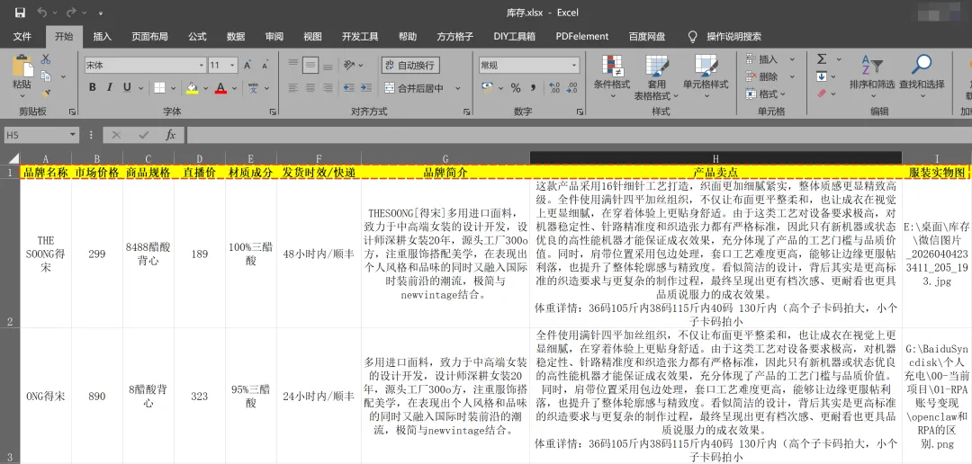 信息分散在Excel里:品牌名称、市场价格、商品规格、材质成分、库存数量……每个款还有一张实物图。
