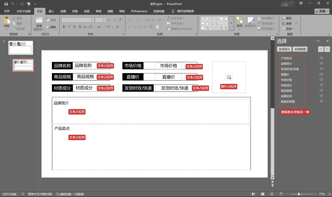 5. 按 Alt+F10 打开"选择窗格",把占位符重命名为Excel表头名称(如`品牌名称`、`市场价格`)