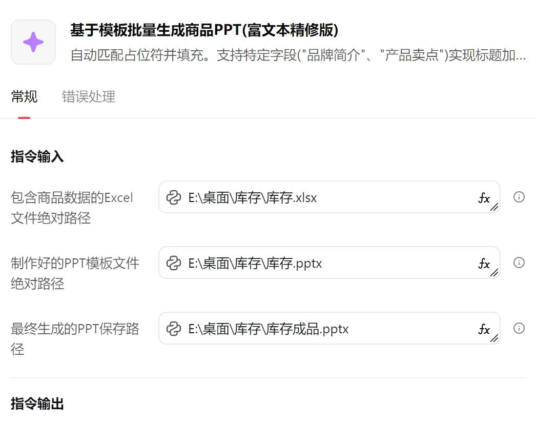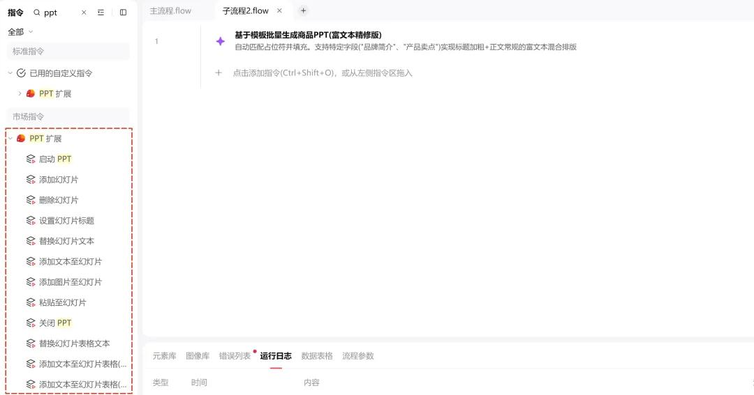 这一步是自动化的核心。在本案例中,我并没有用影刀内置的PPT处理指令来搭建,