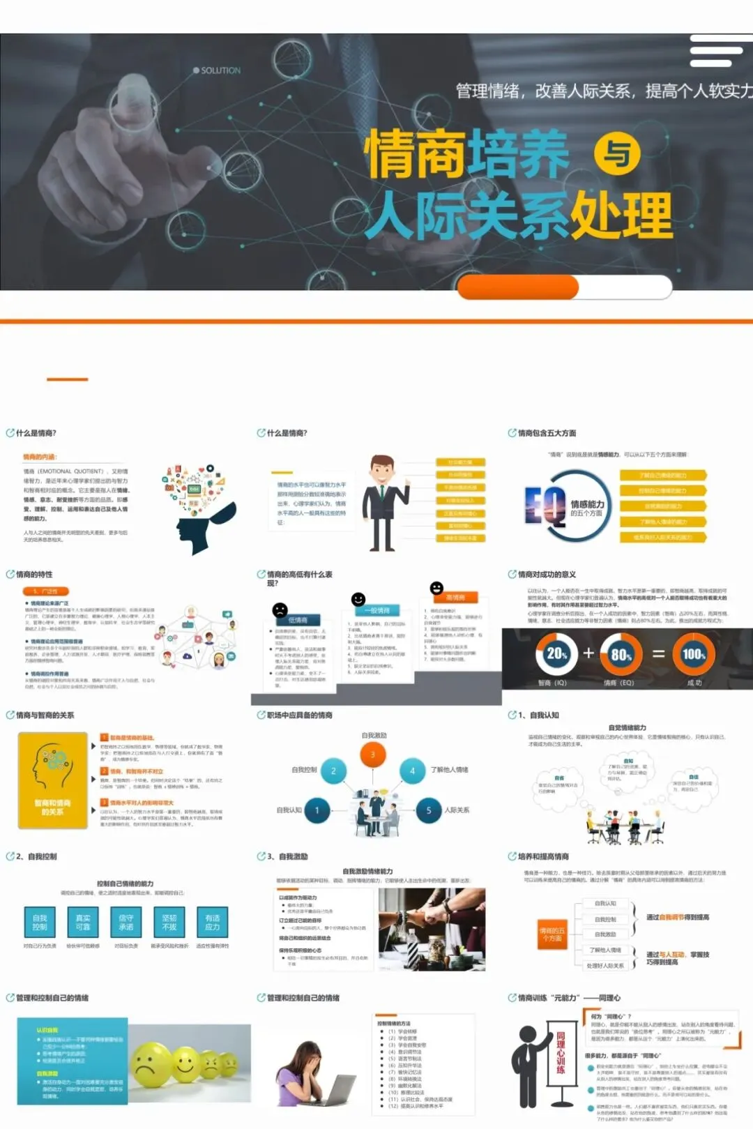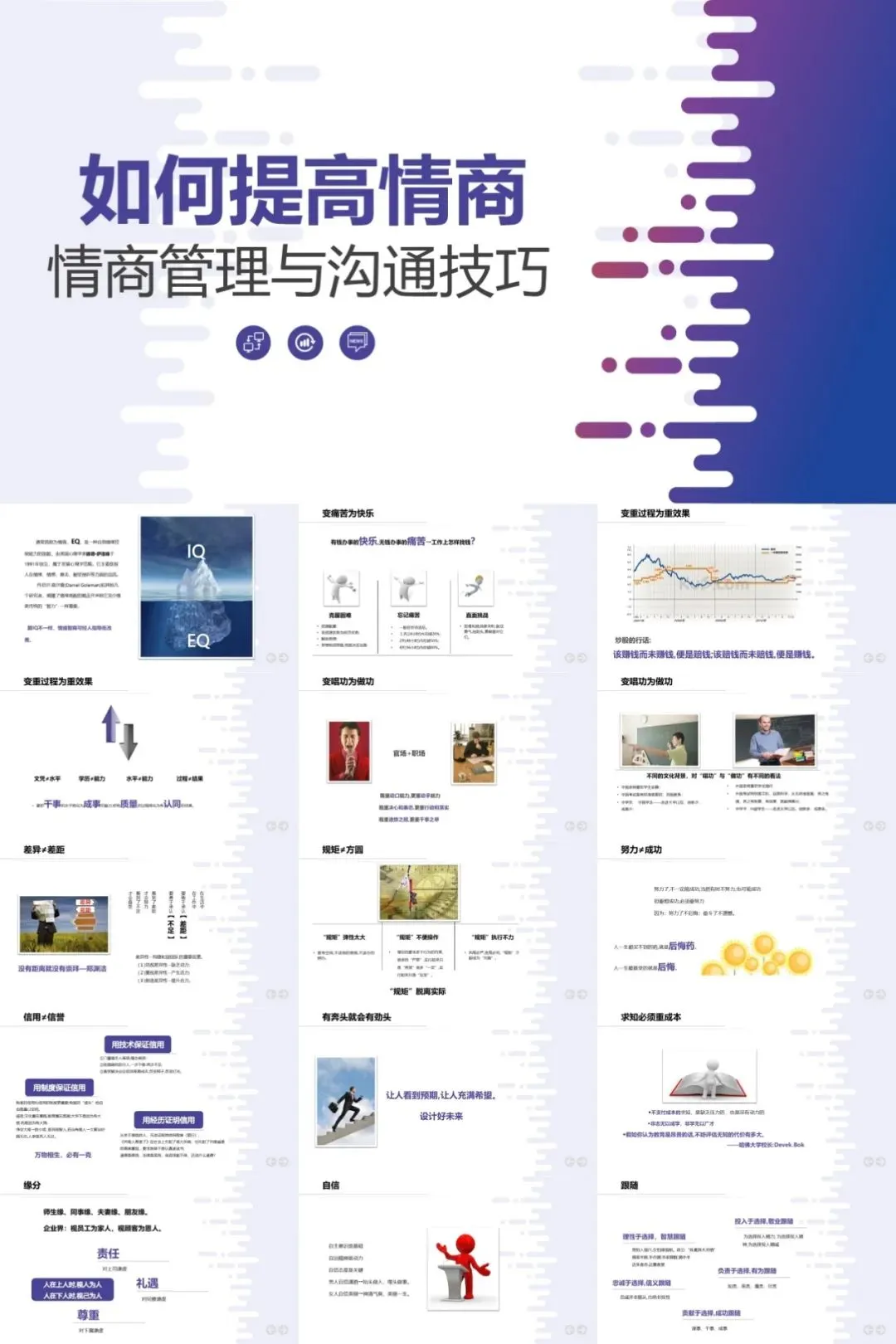 “三分做事,七分做人”并不无道理,一项研究表明,情商对工作的贡献是智商的两倍之多。而大部分的职场人士总是遭遇情商困境,这不是因为性格内向或者学历不高,仅仅是因为不知道什么是真正的职场情商。所以不论对企业还是对HR来说,职场情商的培训是很有必要的。内容不严谨,逻辑不清晰,不会排版;还有可能被打回来要求重做,心如死灰有没有!不用担心,我精选整理了《职场情商培训PPT》送给大家,助HR轻而易举地解决培训课件的难题。通过网盘分享的文件:情商培训