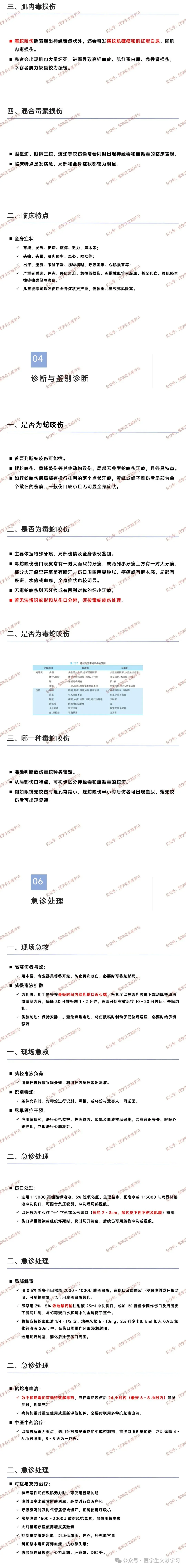 临床特点:神经毒损伤伤口反应较轻,易被忽视,全身症状通常在 1 - 3 小时后出现,如视物模糊、呼吸困难等,呼吸衰竭是主要致死原因,病程较短,危险期在 1 - 2 天,幸存者多无后遗症。血循毒损伤局部肿胀、疼痛剧烈,伴有组织坏死,全身症状在 2 - 3 小时出现,包括出血、溶血、器官衰竭等,危险期长,脏器出血和循环衰竭是主要死因,幸存者常留后遗症。海蛇咬伤除神经毒症状外,还会引发横纹肌瘫痪和肌红蛋白尿,导致高钾血症、急性肾损伤,肌力恢复缓慢。眼镜蛇等咬伤会同时出现神经毒和血循毒症状,发病急,局部和全身症状明显。全身症状多样,严重时可导致昏迷、休克甚至死亡,儿童症状更严重,低体重儿童致死风险高。