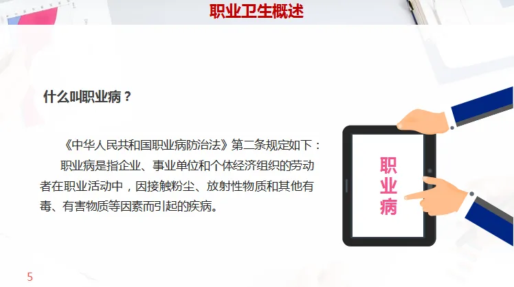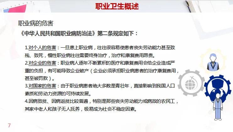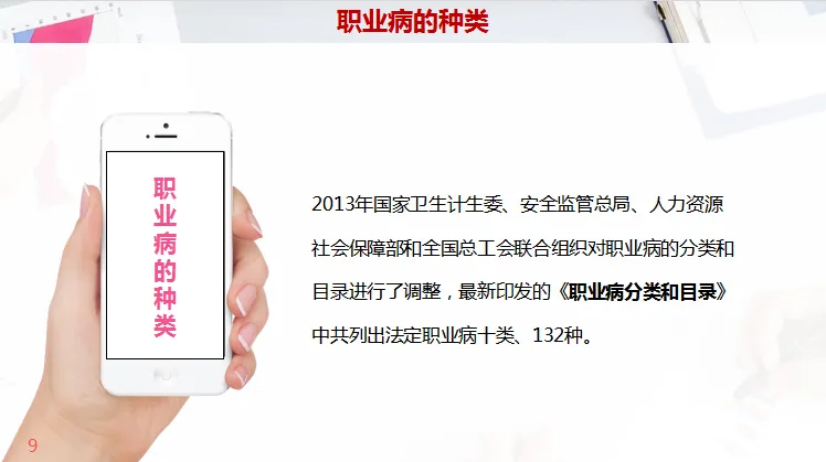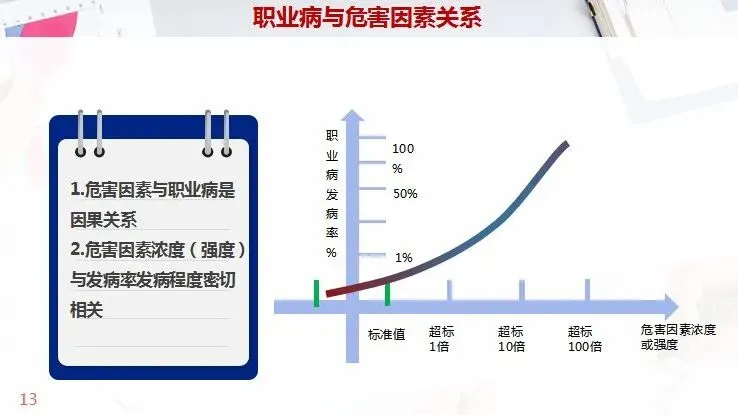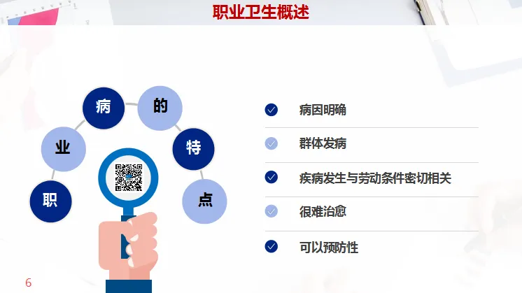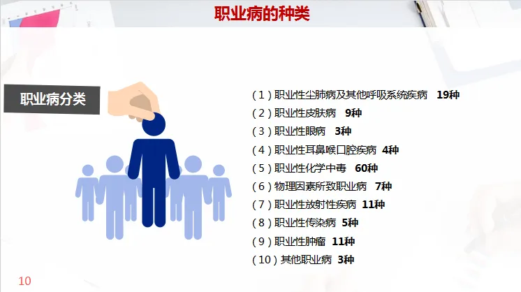 职业病一般病因明确,有特异性,在控制接触后可以控制或消除发病,病因大多可以检测,一般有接触水平(剂量-反应)关系,在不同的接触人群中,常有一定的发病率,如能早期诊断,合理处理,愈后较好职业病防治工作要坚持预防为主、防治结合的方针。职业病防护设施要与主体工程同时设计、同时施工、同时投入生产和使用(简称“三同时”)。职业病的特点:病因明确、群体发病、疾病发生与劳动条件密切相关、很难治愈、可以预防性职业病的种类:根据《职业病分类和目录》(国卫疾控发〔2013〕48号)职业病共包括10类132种,根据《关于印发<职业病分类和目录>的通知》(国卫职健发〔2024〕39号)职业病共包括12类135种(2025年8月1日执行)。我国职业病分类和目录中的法定尘肺病包括矽肺、煤工尘肺、石墨尘肺、碳黑尘肺、石棉肺、滑石尘肺、水泥尘肺、云母尘肺、陶工尘肺、铝尘肺、电焊工尘肺、铸工尘肺及根据《尘肺病诊断标准》和《尘肺病理诊断标准》可以诊断的其他尘肺病。