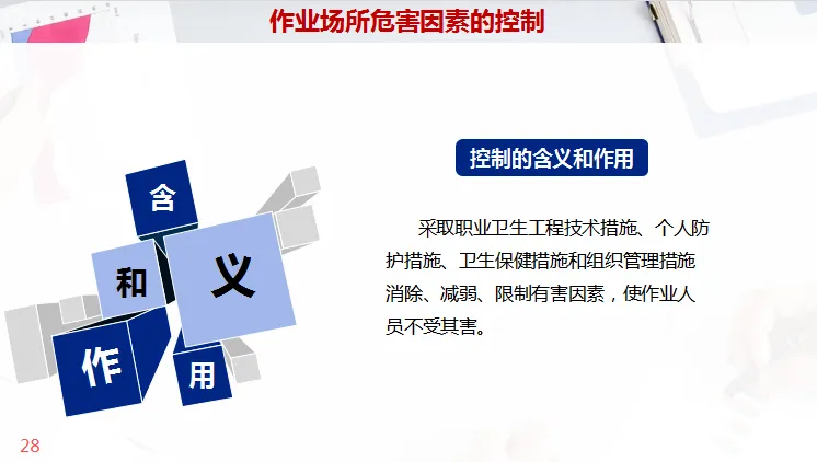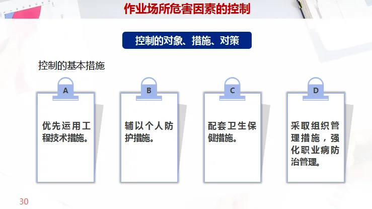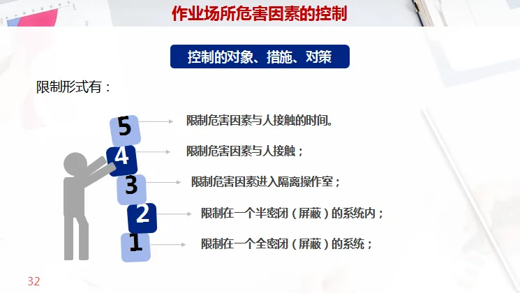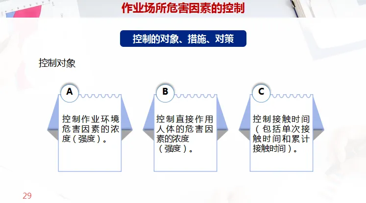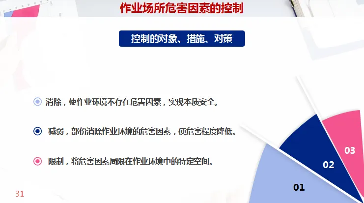 一级预防,即从根本上杜绝或最大可能减少职业性有害因素的接触。二级预防,即定期进行职业健康检查,当职业性有害因素开始损及作业者健康时,应尽早发现,及时采取补救措施,及时治疗,及早脱离职业有害因素,防止病损的进一步发展。三级预防,即对已发展成职业病的患者综合治疗,延长生命。作业场所危害因素的控制对象、基本措施、对策