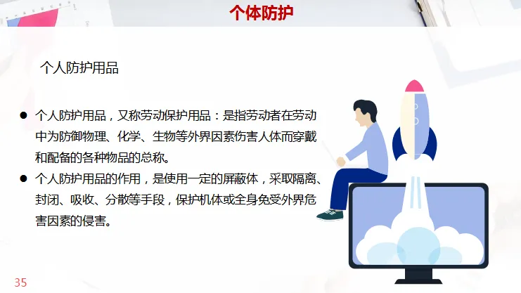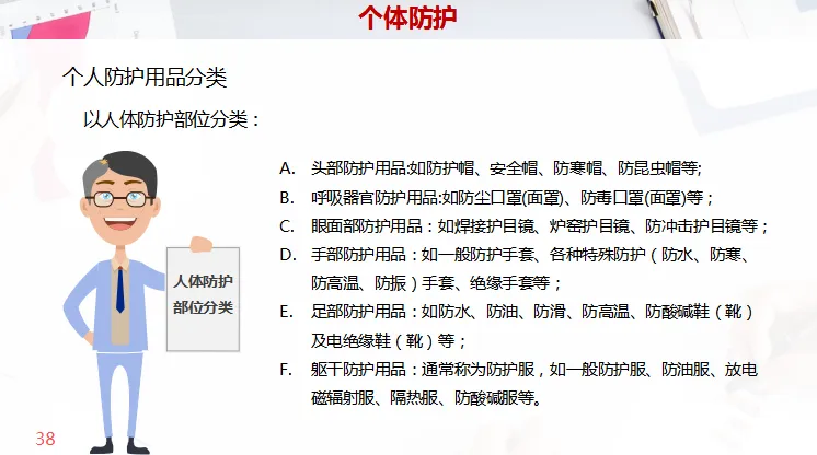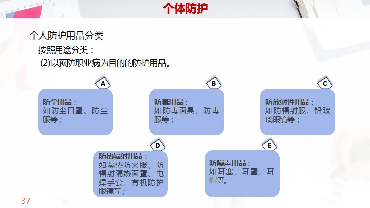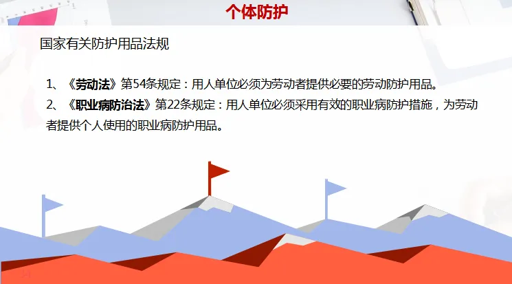 职业病个体防护在《职业病防治法》第22条规定:用人单位必须采用有效的职业病防护措施,为劳动者提供个人使用的职业病防护用品。个人防护用品,又称劳动保护用品:是指劳动者在劳动中为防御物理、化学、生物等外界因素伤害人体而穿戴和配备的各种物品的总称。