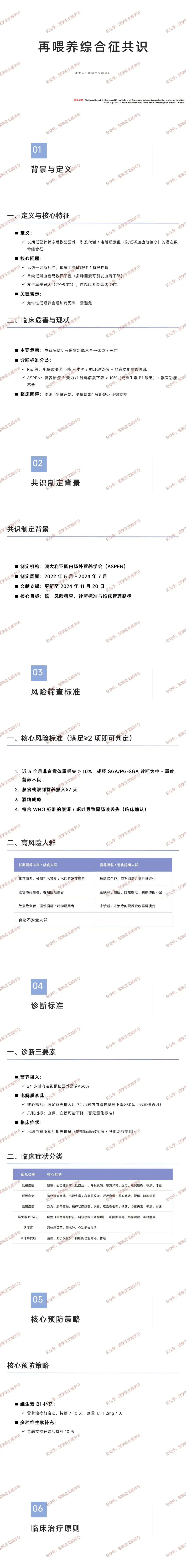 再喂养综合征是长期低营养状态后恢复营养引发的致命性代谢 / 电解质紊乱(以低磷血症为核心),临床需通过精准风险筛查、明确诊断标准,采取 “足量启动喂养 + 维生素补充 + 动态监测” 策略,避免传统 “慢启动” 误区,平衡营养供给与风险防控。