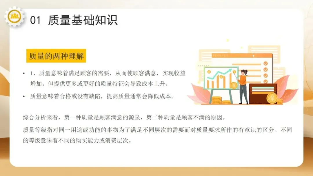1、质量意味着满足顾客的需要,从而使顾客满意,实现收益增加。但提供更多或更好的质量特征会导致成本上升。