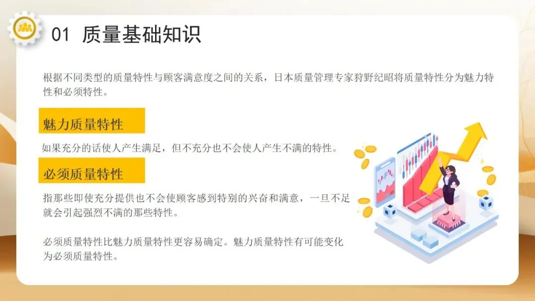 根据不同类型的质量特性与顾客满意度之间的关系,日本质量管理专家狩野纪昭将质量特性分为魅力特性和必须特性。