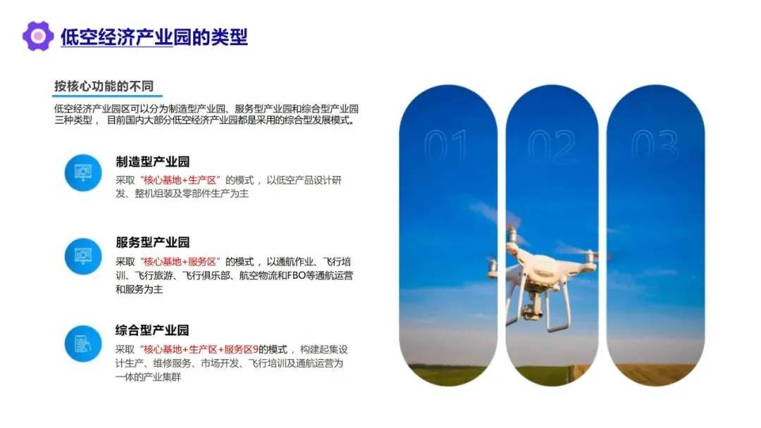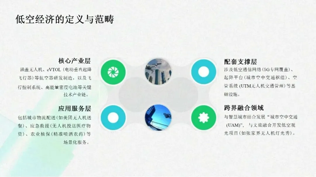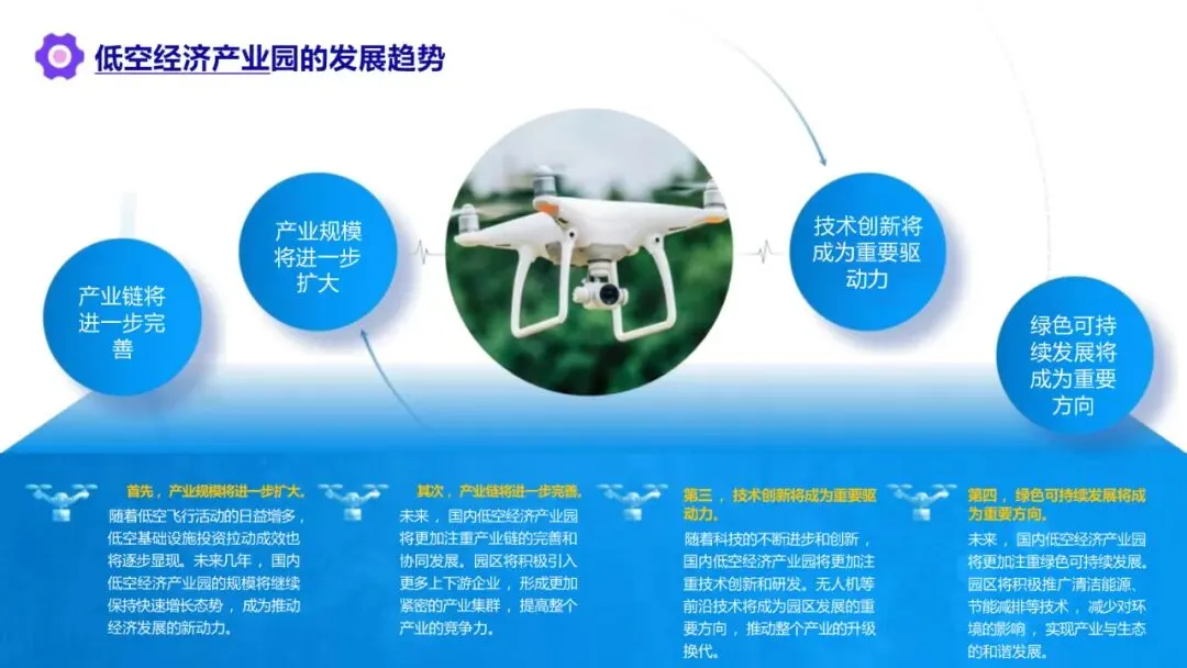 从经济维度看,它是培育新质生产力的重要抓手。低空经济作为新兴产业,2024年已呈现爆发式增长态势,国内注册无人机达215.8万架,无人机飞行时长同比增长15.3%。通过产业园的集聚效应,能够有效整合资金、技术、人才等要素,降低企业研发与运营成本,推动产业规模快速扩张。据测算,一个成熟的低空经济产业园可形成年产值超100亿元的产业集群,直接创造数千个就业岗位,并带动上下游产业链数万人就业,成为区域经济增长的新引擎。