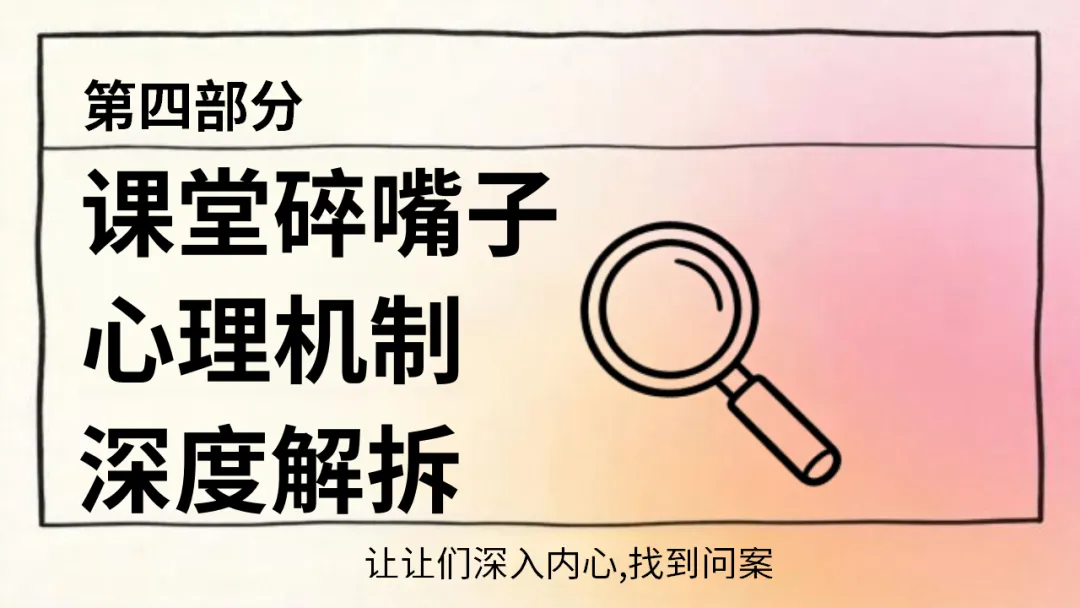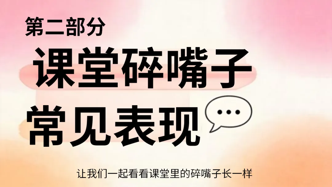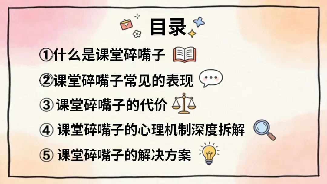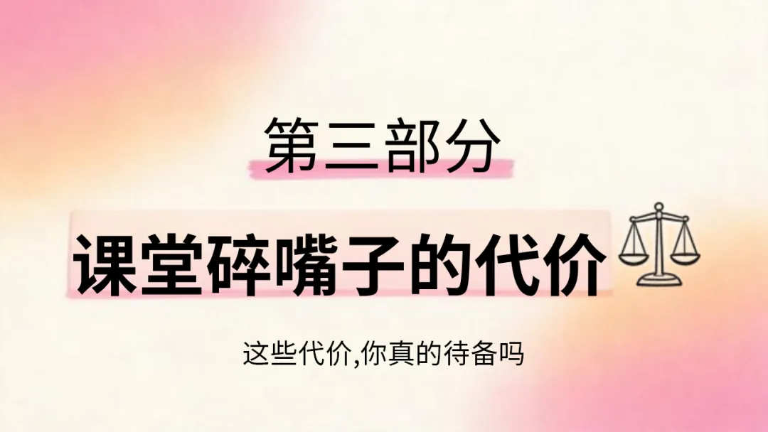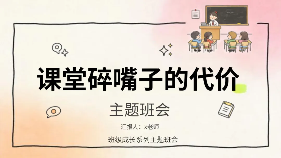 班级管理主题班会ppt:课堂碎嘴子的代价和解决方法/班会:课堂碎嘴子的心理机制深度拆解,ppt课件共27页(无水印可编辑ppt课件完整版,下载方式见文末)课堂是我们学习知识、成长进步的重要场所,课堂纪律是保障学习效果的基础。课堂碎嘴子看似是小事,却会带来诸多代价。