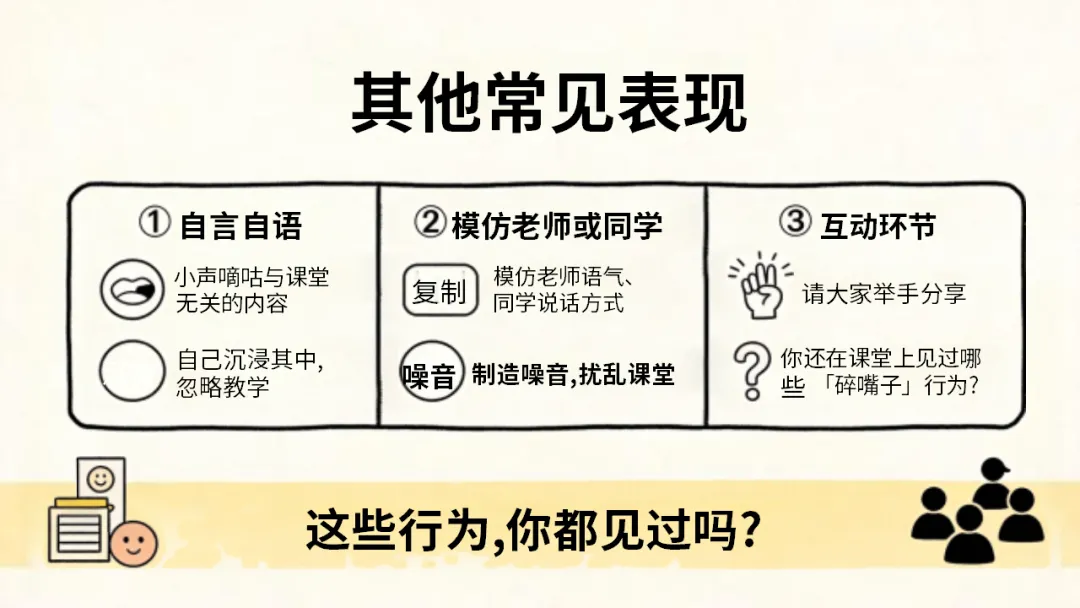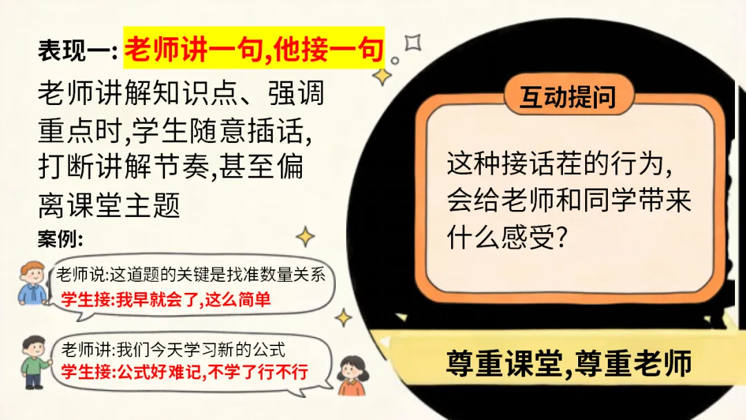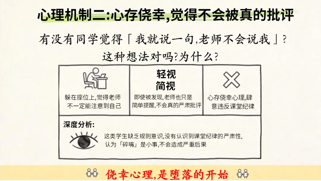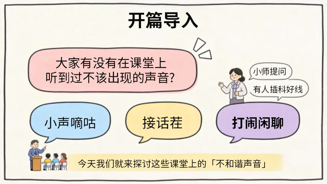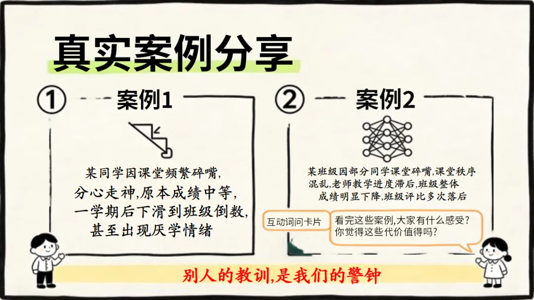 班级管理主题班会ppt:课堂碎嘴子的代价和解决方法/班会:课堂碎嘴子的心理机制深度拆解,ppt课件共27页(无水印可编辑ppt课件完整版,下载方式见文末)课堂是我们学习知识、成长进步的重要场所,课堂纪律是保障学习效果的基础。课堂碎嘴子看似是小事,却会带来诸多代价。