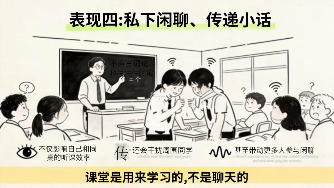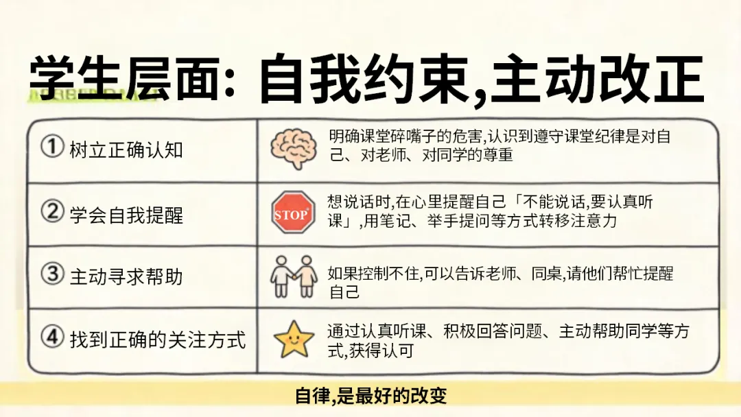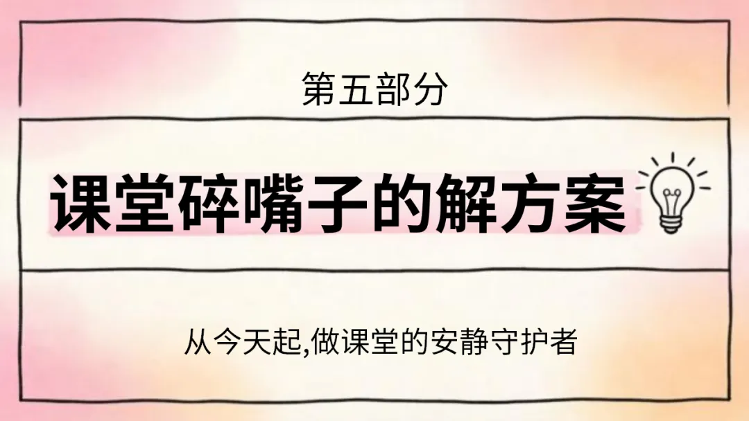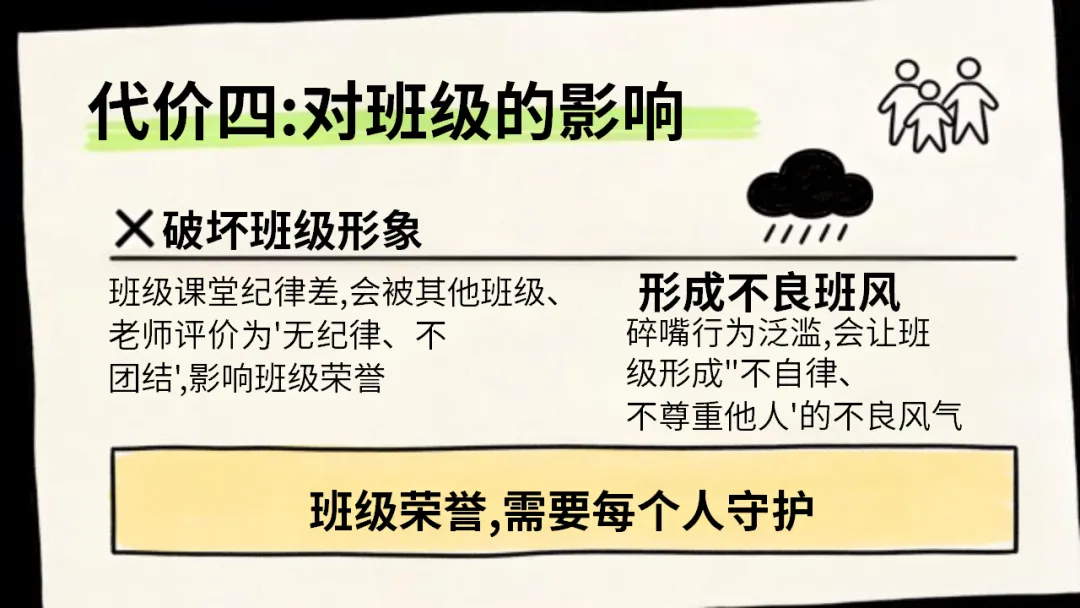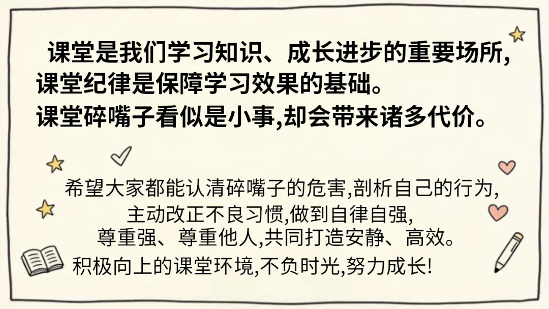 希望大家都能认清碎嘴子的危害,剖析自己的行为,主动改正不良习惯,做到自律自强,尊重强、尊重他人,共同打造安静、高效。积极向上的课堂环境,不负时光,努力成长!