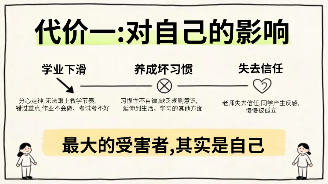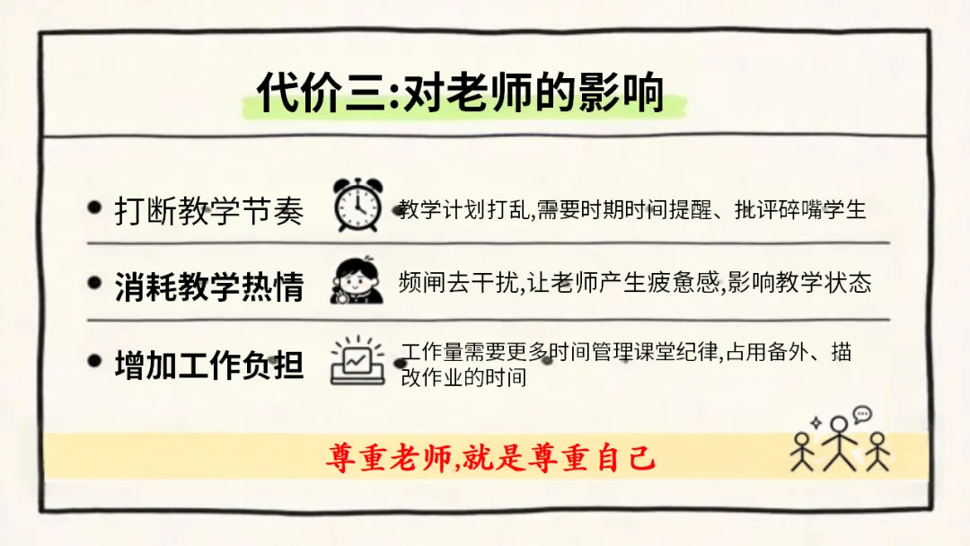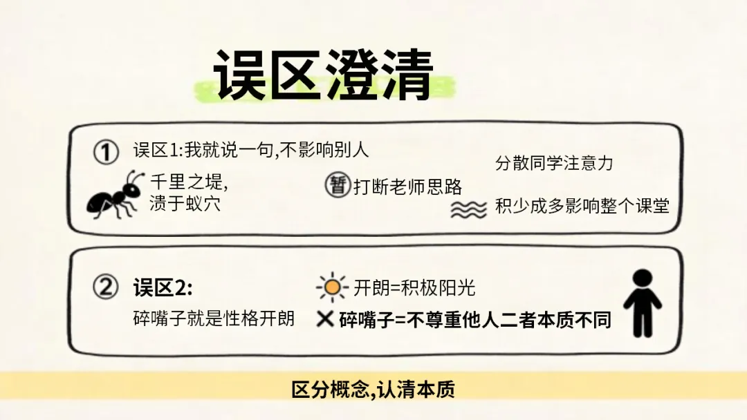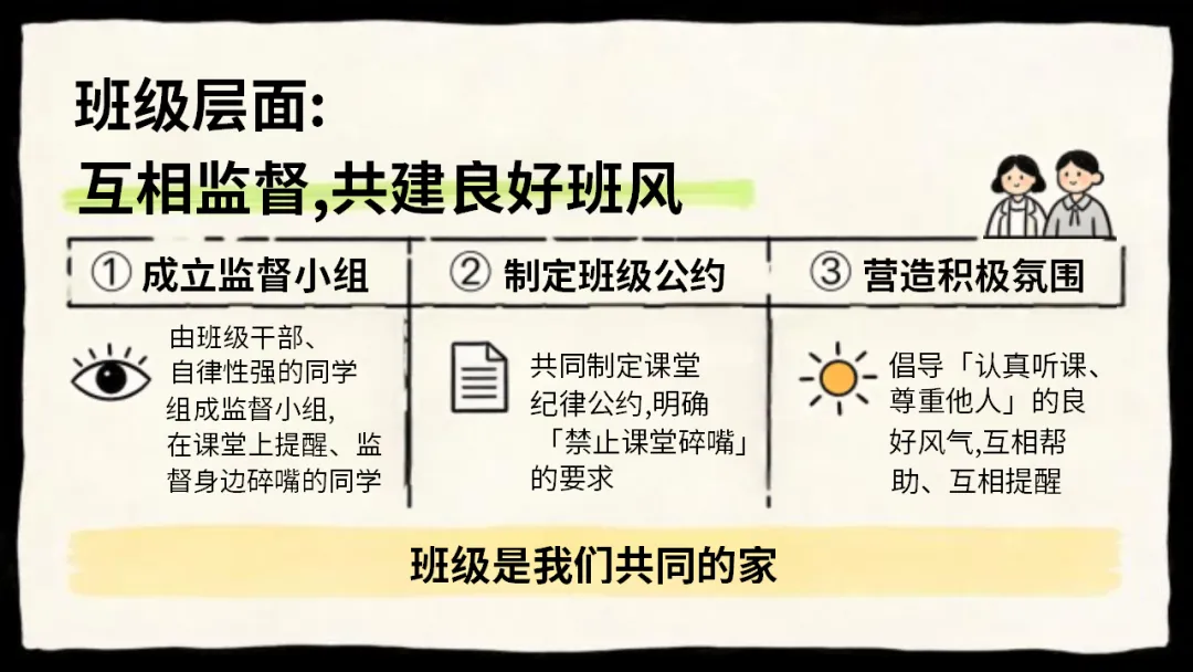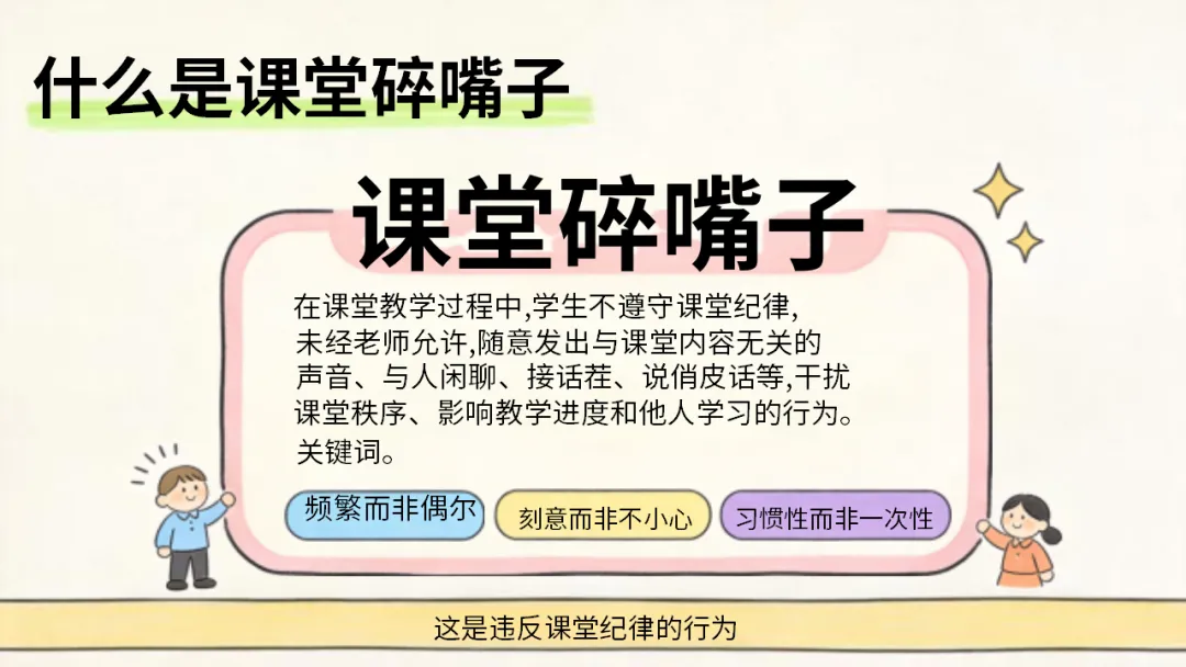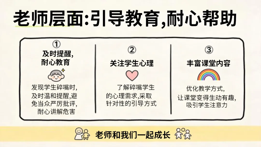希望大家都能认清碎嘴子的危害,剖析自己的行为,主动改正不良习惯,做到自律自强,尊重强、尊重他人,共同打造安静、高效。积极向上的课堂环境,不负时光,努力成长!
