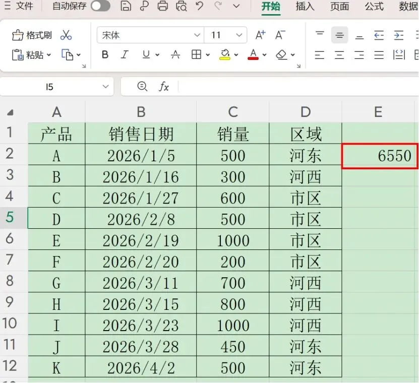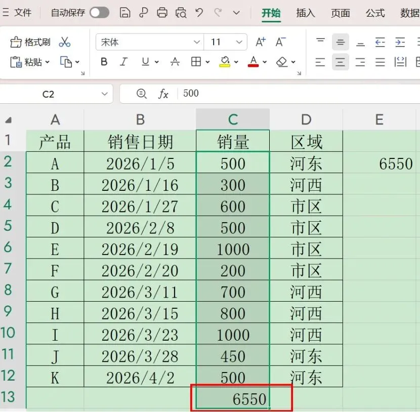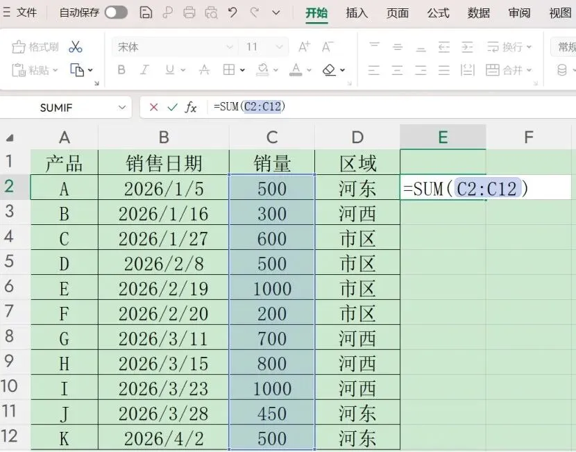 很简单,就是框选求和区域,例如我们想在下图E2空白单元格将所有产品的销售进行求和,那么直接输入公式=SUM(),然后括号内框选C2到C12的区域,再按下Enter键,即求和完成。