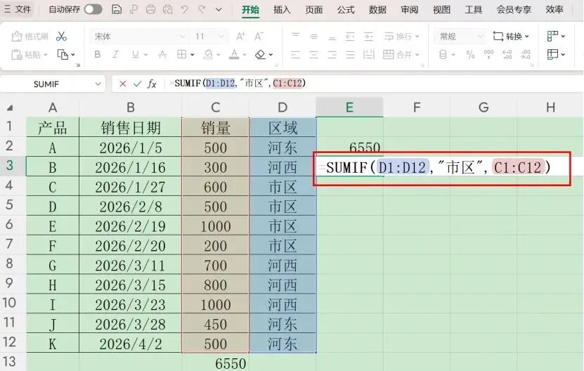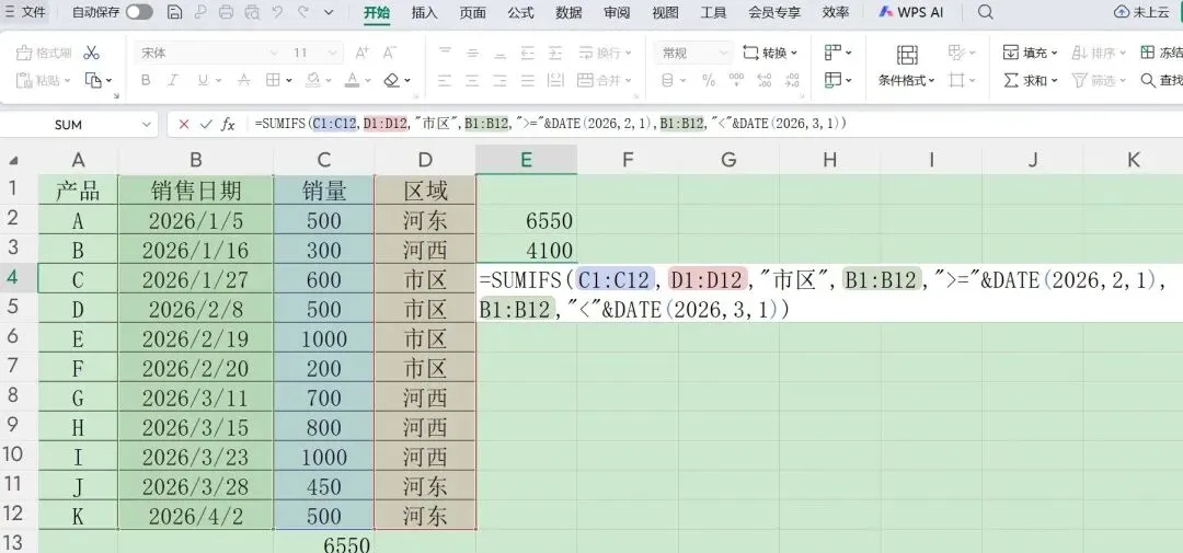 那么整个公式就是=SUMIFS(C1:C12,D1:D12,"市区",B1:B12,">="&DATE(2026,2,1),B1:B12,"<"&DATE(2026,3,1))