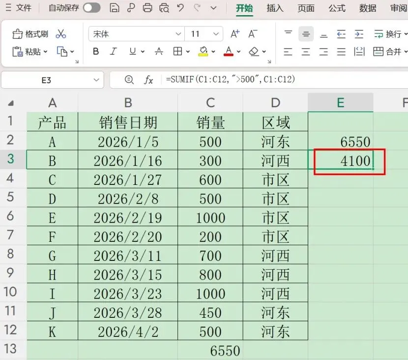 公式=SUMIF(C1:C12,">500",C1:C12)