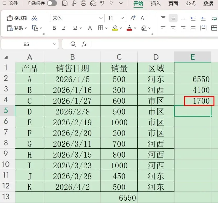 如下图所示,若想在E4单元格求和市区在2026年2月份的总销量,先输入公式=SUMIFS()