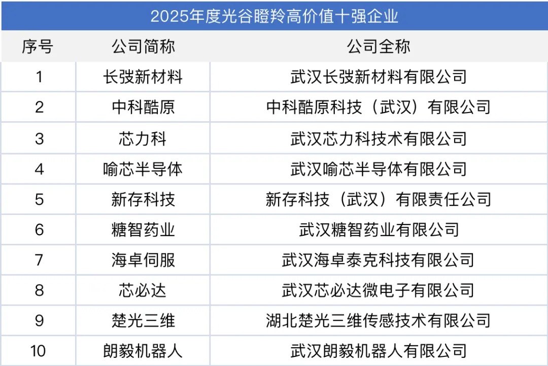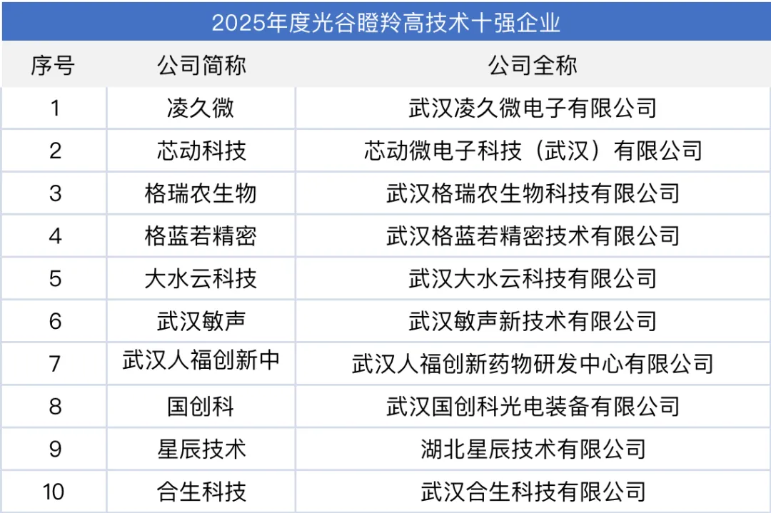 2025年度光谷瞪羚高技术十强企业:凌久微、芯动科技、格瑞农生物、格蓝若精密、国创科、星辰技术、合生科技等。