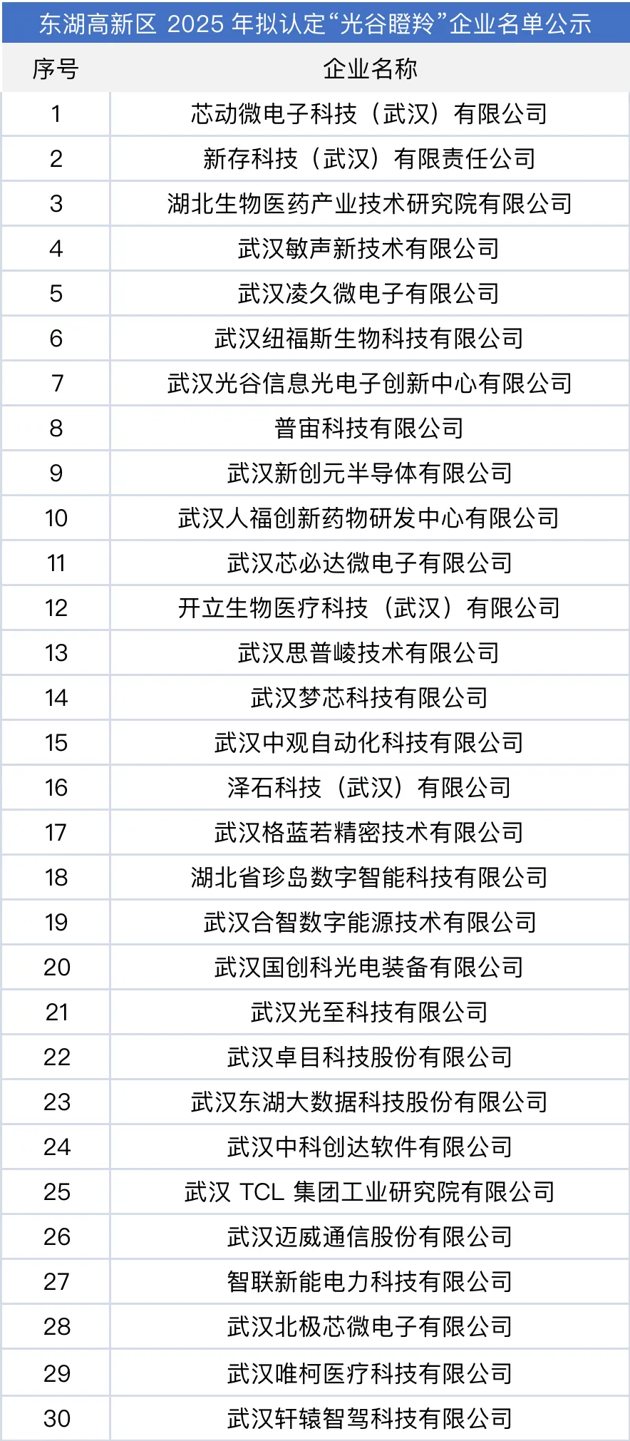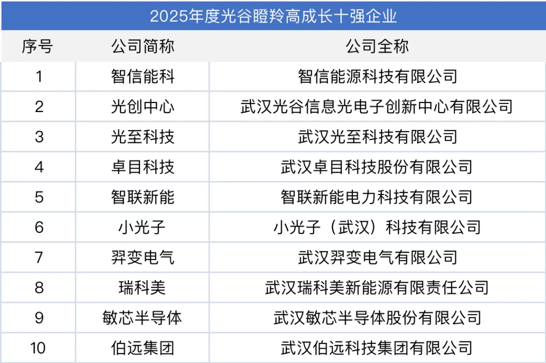2025年度光谷瞪羚高成长十强企业:智信能科、光至科技、卓目科技、小光子、羿变电气、瑞科美、敏芯半导体等。