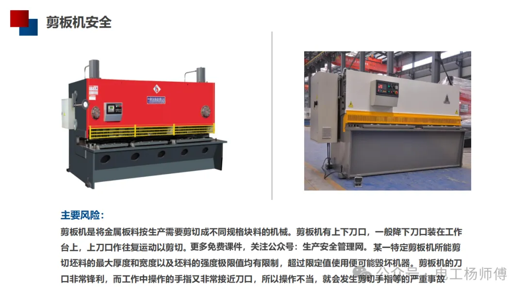 剪板机是一种用于金属板材剪切的设备,其刀口锋利且操作时手指接近危险区域,因此危险性较高。