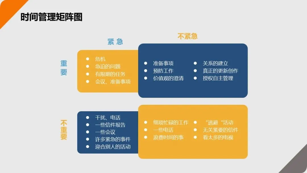 - 重要不紧急(如学习新技能、维护客户关系):重点做,每天留 60% 时间(这是减少 “紧急事” 的关键);