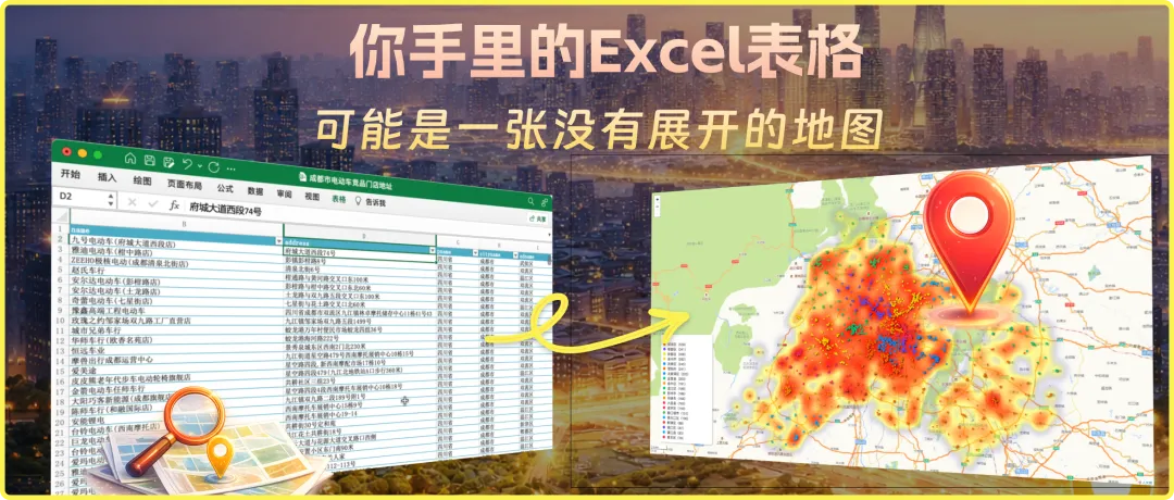 地图真正需要的,是坐标——经纬度。而我们表格里写的,是"天府大道北段""人民南路三段"这样的文字地址。