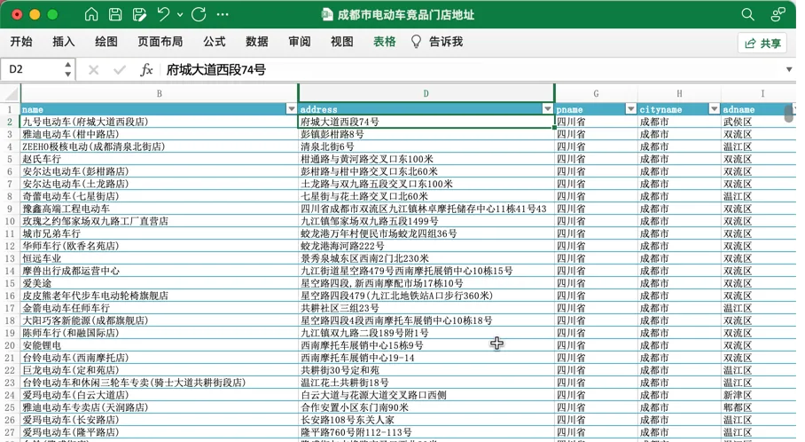 你打开 Excel地址表格,盯着屏幕看了好大一会儿:武侯区府城大道西段74号、锦江区樱花街983号、锦华路三段174号、青羊区锦里中路12号……