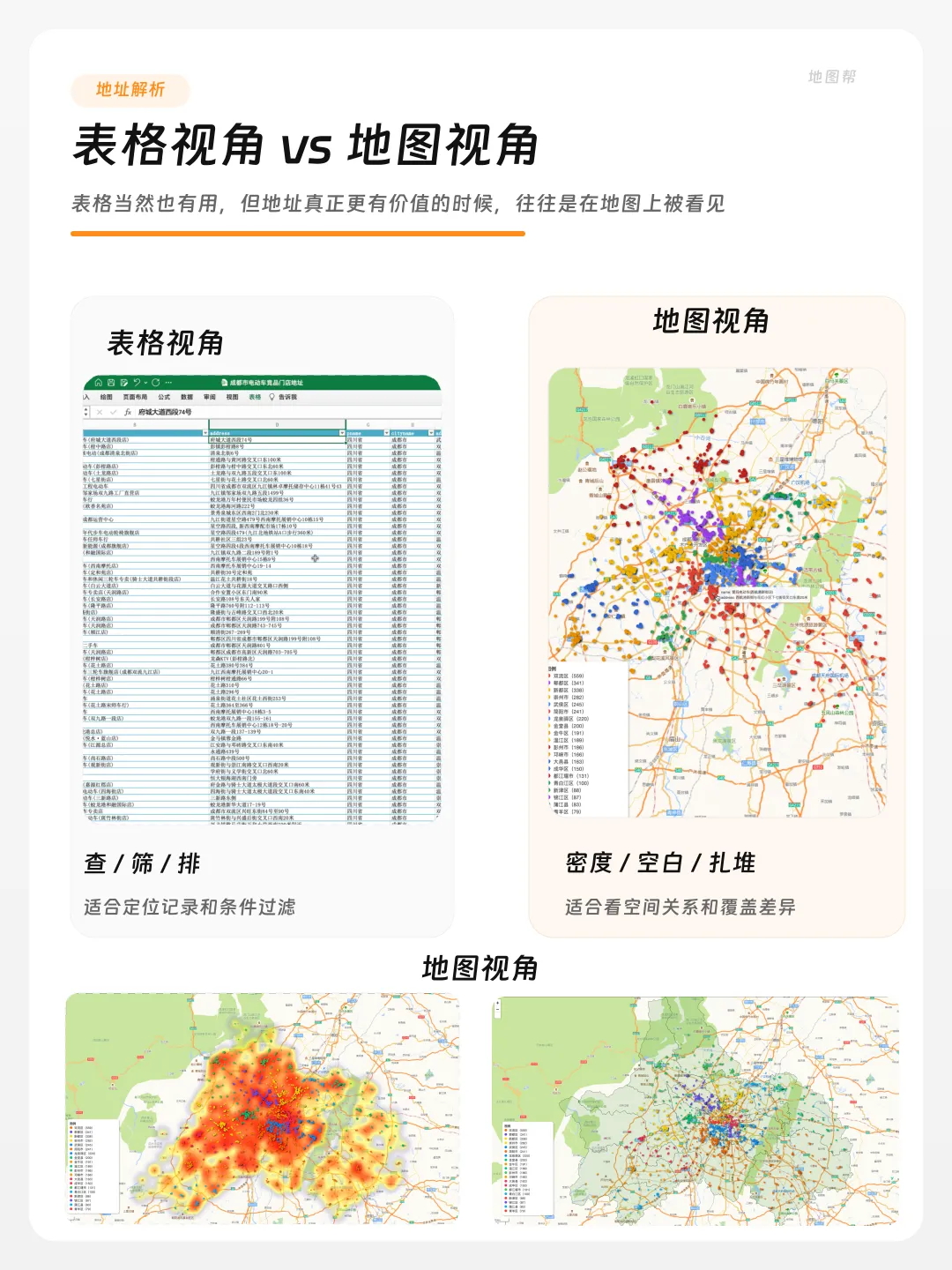 同样一份数据,放在表格里,你看到的是一行一行的字。 放到地图上,你看到的是分布、密度、空白和扎堆。