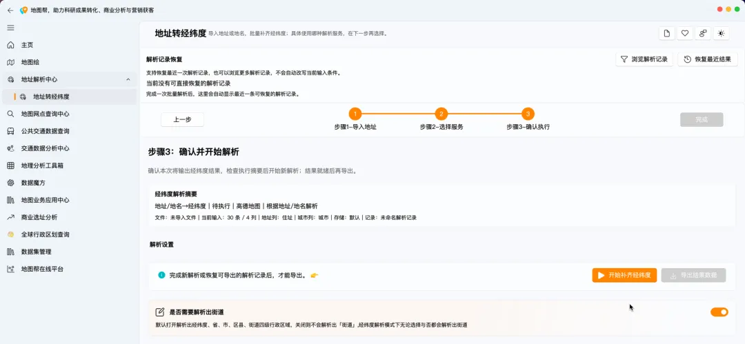 这个步骤以前很麻烦,现在工具已经跟上来了。 比如地图帮就有专门的地址解析功能,可以把一整列文字地址批量转成坐标,不需要手动一条条查。