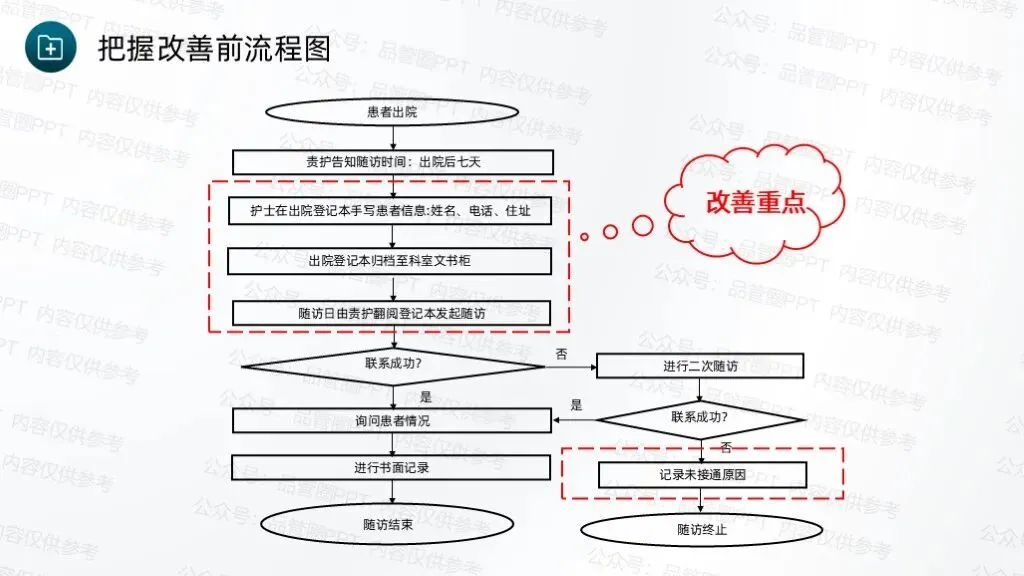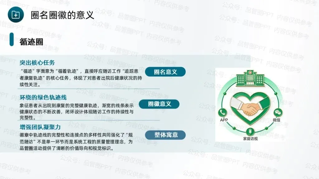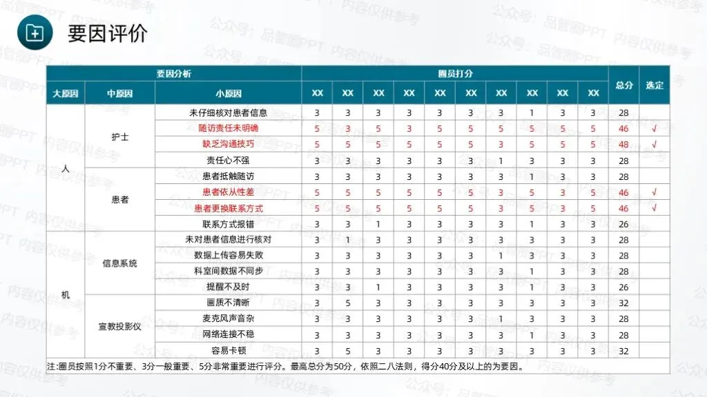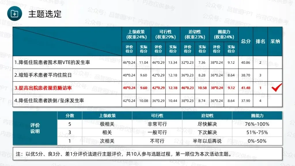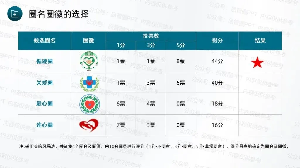 成立7人QCC圈组,通过持续改进工作方法、优化服务流程,完善随访体系,推动科室护理工作朝着规范化、精细化方向发展。采用头脑风暴法,共收集到4个候选圈名及对应圈徽,最终“循迹圈”以最高票数当选为圈名及对应圈徽,充分体现了团队成员的共同意愿,也为后续活动开展奠定了统一的目标导向。“循迹”字面意为“循着轨迹”,直接呼应随访工作“追踪患者康复轨迹”的核心任务,体现对患者出院后健康状况的持续性关注。环绕的绿色轨迹线象征患者从出院到康复的完整健康轨迹,渐宽的线条表示健康状态的不断改善,闭环设计体现随访工作的持续性与完整性,也寓意团队将全程追踪患者康复情况,形成“出院-随访-指导-康复”的完整服务链条,守护患者院外健康。全体圈员经过头脑风暴,结合科室临床工作实际,梳理出多项待改进问题,随后采用531打分法对各项问题进行量化评分,最终确定“提高出院患者规范随访率”为本次QCC活动主题。随访也称之为随诊,是医院根据医疗、科研、教学的需要,对诊治后患者的疾病疗效、发展状况继续追踪观察,将医疗服务延伸至院外。出院随访是临床工作的重要组成部分,通过对出院患者或慢性疾病患者进行医疗追踪服务,了解患者的预后、康复情况及远期疗效,并给予治疗建议,更好地为患者服务叫,是医院提供优质服务的一种新型模式,也是以患者为中心理念的重要体现。