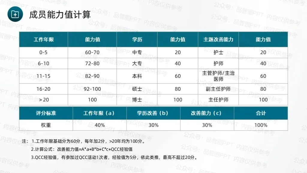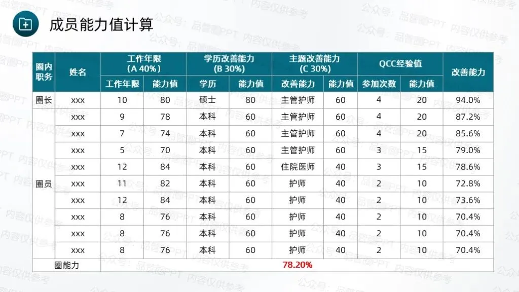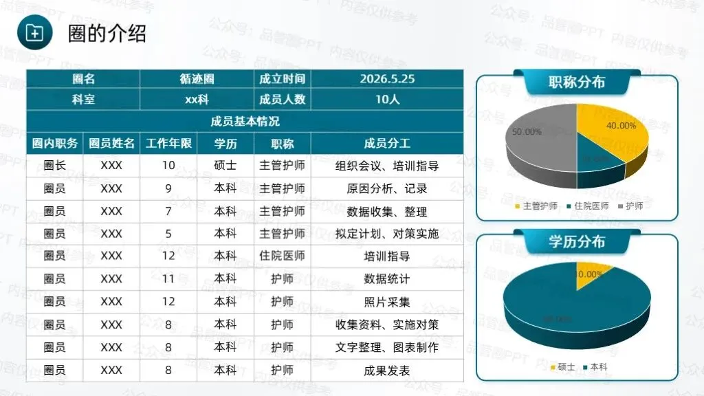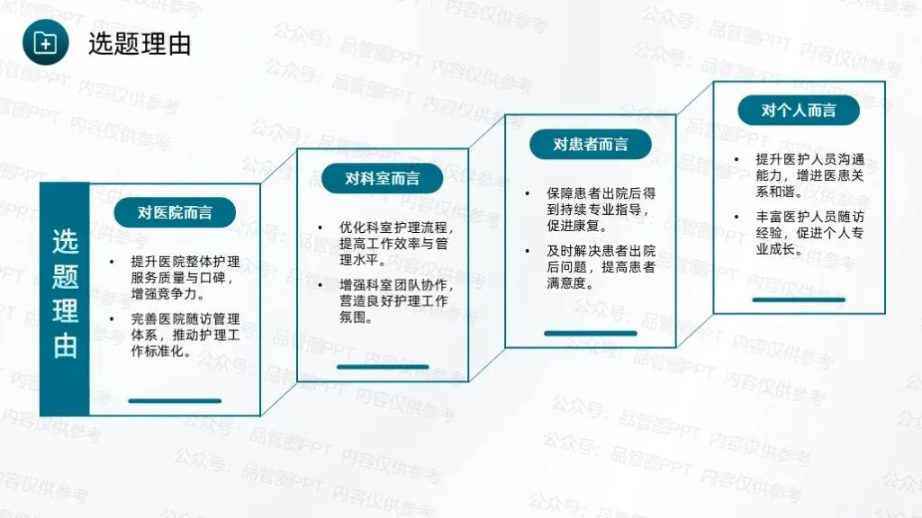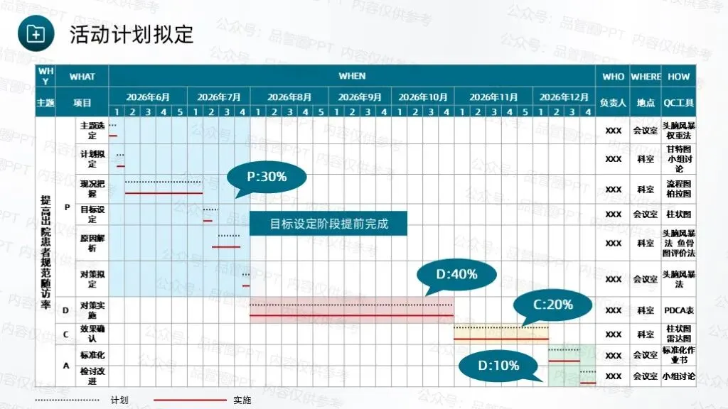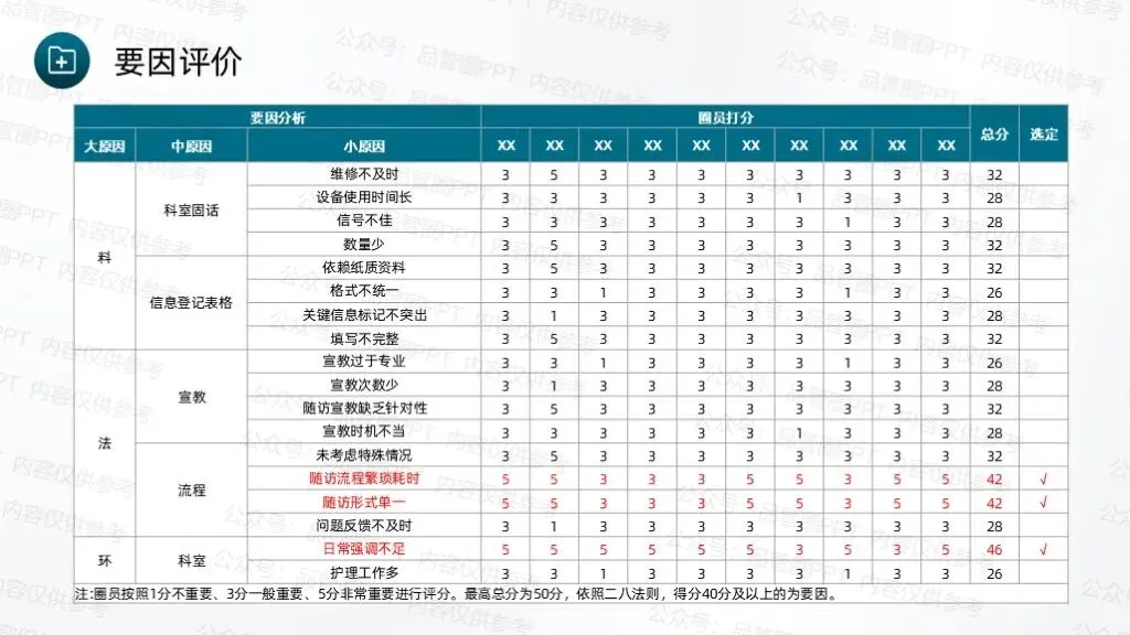 成立7人QCC圈组,通过持续改进工作方法、优化服务流程,完善随访体系,推动科室护理工作朝着规范化、精细化方向发展。采用头脑风暴法,共收集到4个候选圈名及对应圈徽,最终“循迹圈”以最高票数当选为圈名及对应圈徽,充分体现了团队成员的共同意愿,也为后续活动开展奠定了统一的目标导向。“循迹”字面意为“循着轨迹”,直接呼应随访工作“追踪患者康复轨迹”的核心任务,体现对患者出院后健康状况的持续性关注。环绕的绿色轨迹线象征患者从出院到康复的完整健康轨迹,渐宽的线条表示健康状态的不断改善,闭环设计体现随访工作的持续性与完整性,也寓意团队将全程追踪患者康复情况,形成“出院-随访-指导-康复”的完整服务链条,守护患者院外健康。全体圈员经过头脑风暴,结合科室临床工作实际,梳理出多项待改进问题,随后采用531打分法对各项问题进行量化评分,最终确定“提高出院患者规范随访率”为本次QCC活动主题。随访也称之为随诊,是医院根据医疗、科研、教学的需要,对诊治后患者的疾病疗效、发展状况继续追踪观察,将医疗服务延伸至院外。出院随访是临床工作的重要组成部分,通过对出院患者或慢性疾病患者进行医疗追踪服务,了解患者的预后、康复情况及远期疗效,并给予治疗建议,更好地为患者服务叫,是医院提供优质服务的一种新型模式,也是以患者为中心理念的重要体现。