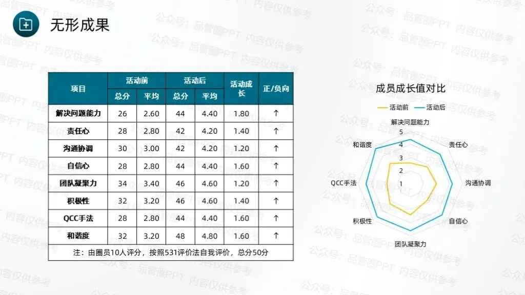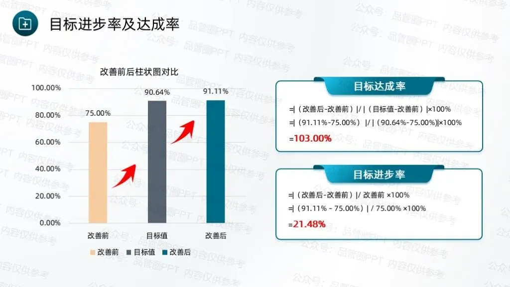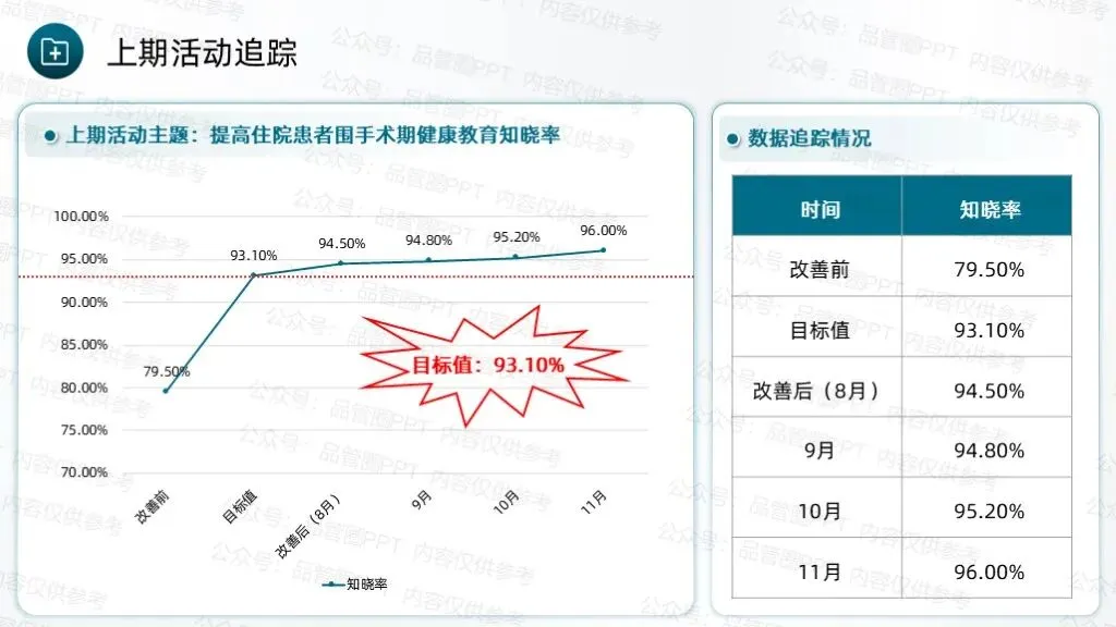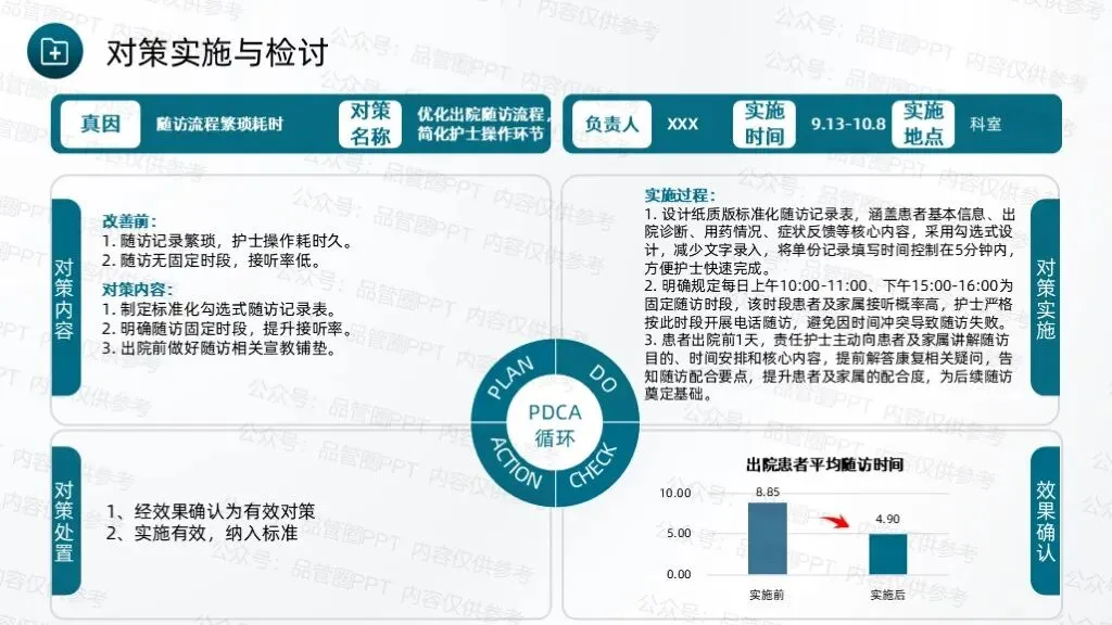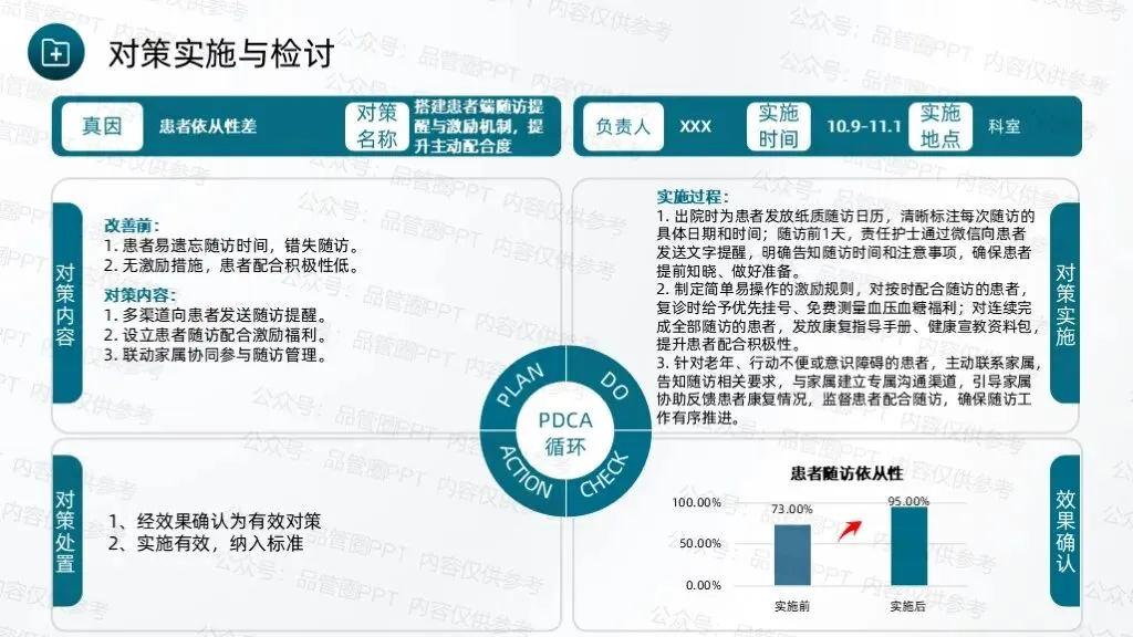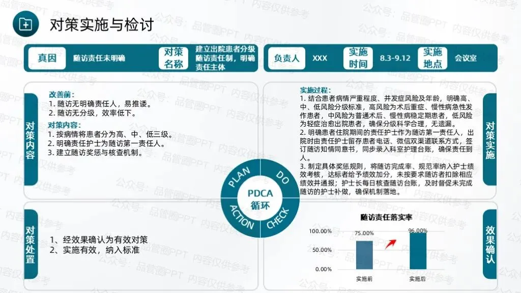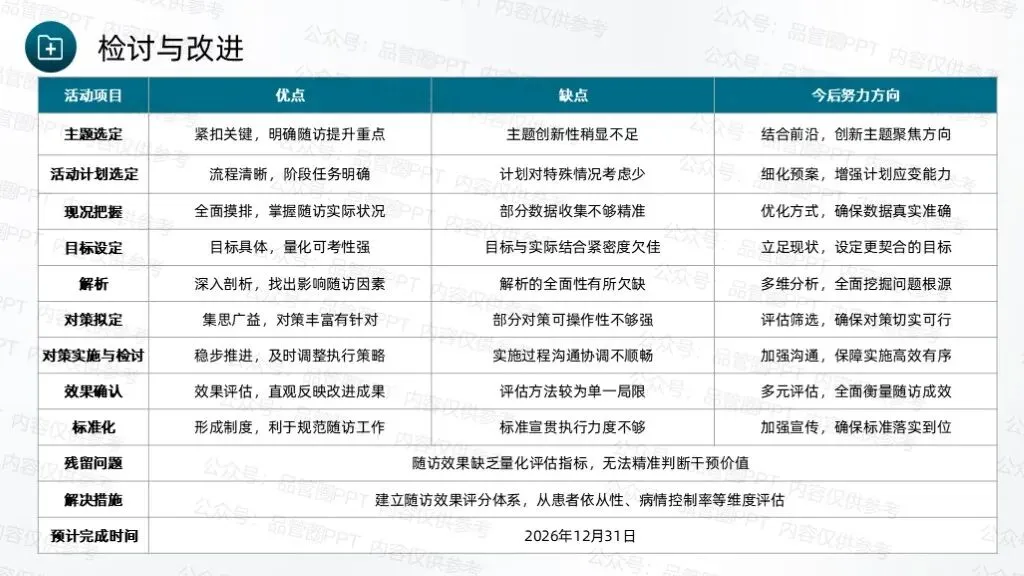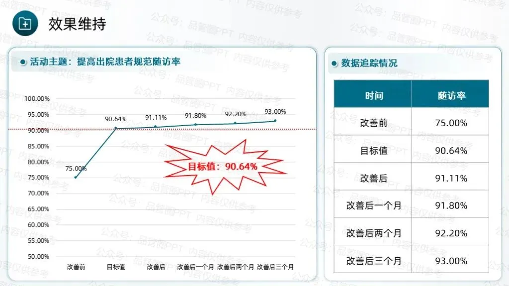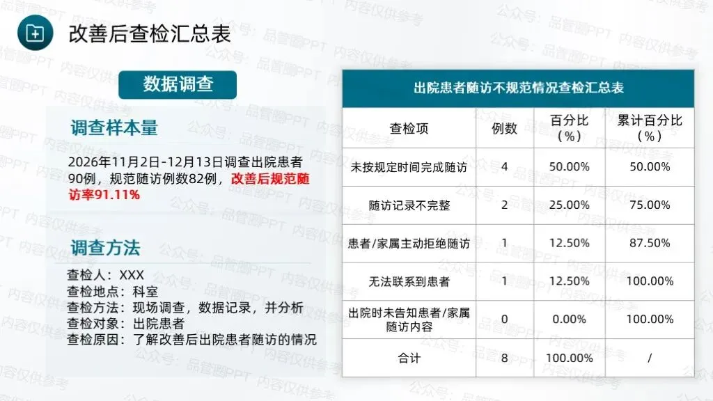 经统计,90例患者中,规范随访例数为8例,计算得出改善后规范随访率为91.11%,超出预设目标值90.64%。绘制柏拉图进行对比分析,通过对比可以清晰地看到各项缺陷值的显著降低,尤其是改善前占比最高的未按规定时间完成随访、随访记录不完整两项问题,改善后占比大幅下降,充分说明各项改进措施针对性强、执行到位,有效解决了核心问题。通过柱状图数据对比,清晰展示改善实施前后规范随访率的变化情况,改善前规范随访率仅为75.00%,改善后提升至91.11%。通过本次QCC活动的开展,团队成员在问题解决、沟通协作、流程优化等方面的能力得到显著提升,工作责任感明显增强,形成了团结协作、积极配合、主动担当的工作氛围。制定《出院患者规范随访标准化作业书》,确保所有护理人员均能严格按照作业书开展随访工作,避免因操作不统一导致的随访不规范问题,实现随访工作的常态化、标准化管理,巩固改善成果,防止问题反弹。通过不断的检讨与改进,确保能够适应变化,持续进步,为患者提供更加优质、高效的护理服务。下期活动主题:降低住院患者围术期VTE的发生率