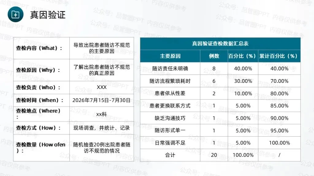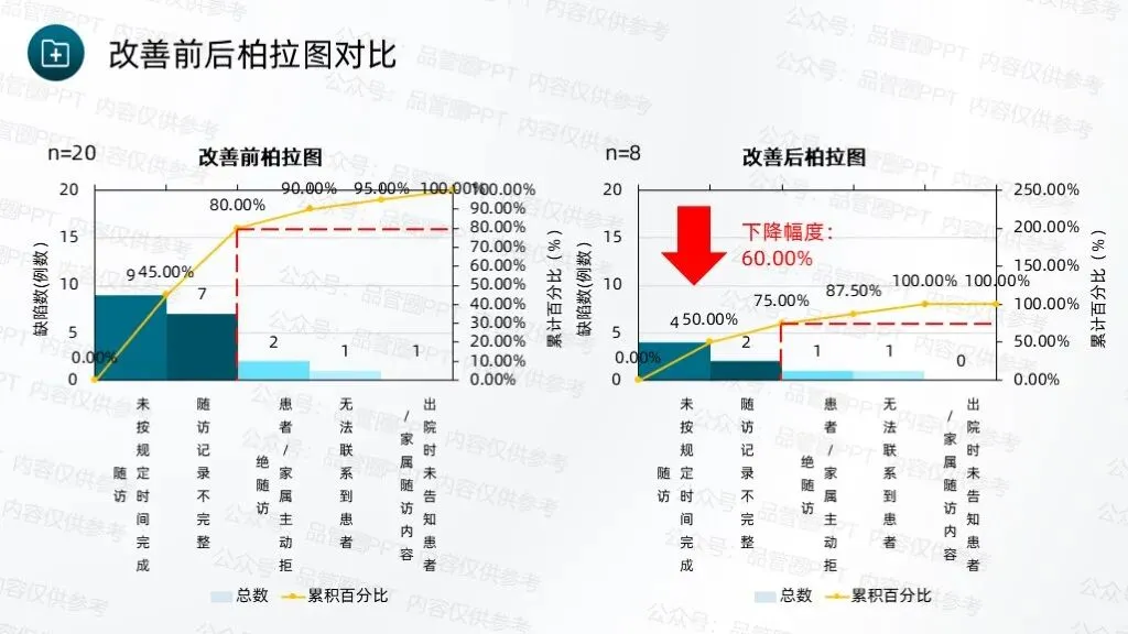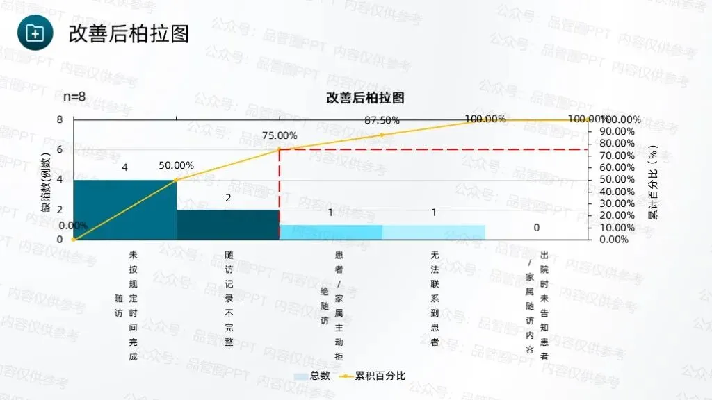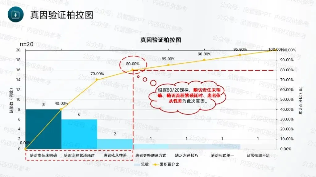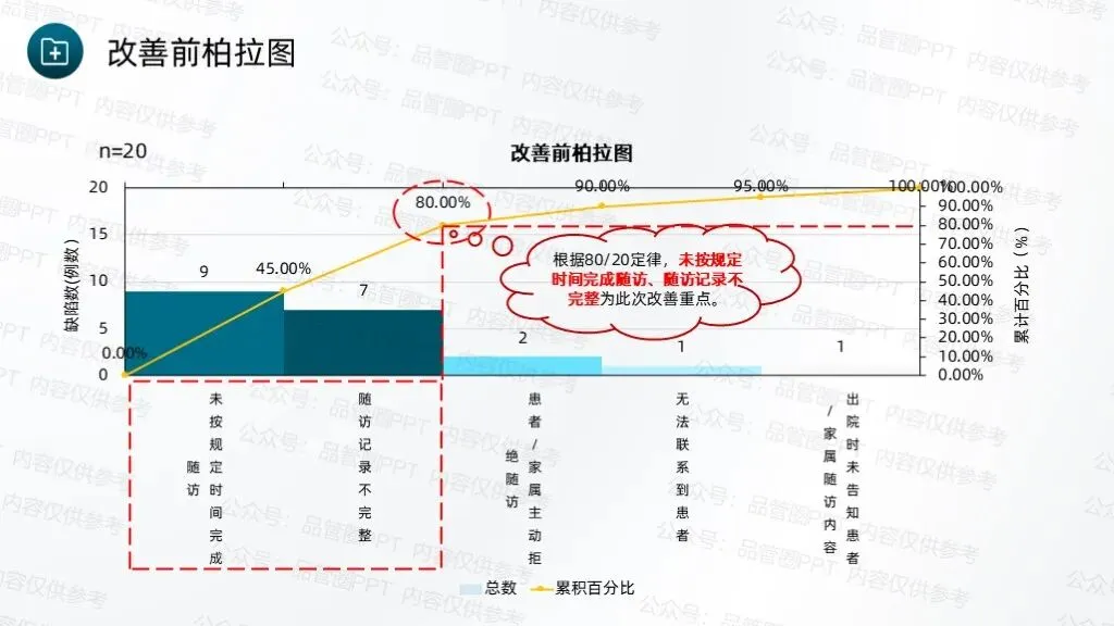 甘特图清晰标注各项任务的起止时间、具体负责人、工作内容及预期进度,明确各环节的时间节点和责任分工,确保各项工作有序衔接、高效推进。经统计,80例患者中,规范随访例数为60例,计算得出改善前现况值为75.00%。根据80/20定律,未按规定时间完成随访、随访记录不完整为此次改善重点。