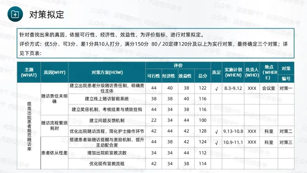 对通过鱼骨图、评价表等工具分析出的要因进行深入探究和实地考察。根据80/20定律,最终确定随访责任未明确、随访流程繁琐耗时、患者依从性差为此次问题的真因,为后续对策拟定提供精准靶向。针对查找出来的真因,依据可行性、经济性、效益性,为评价指标,进行对策拟定。