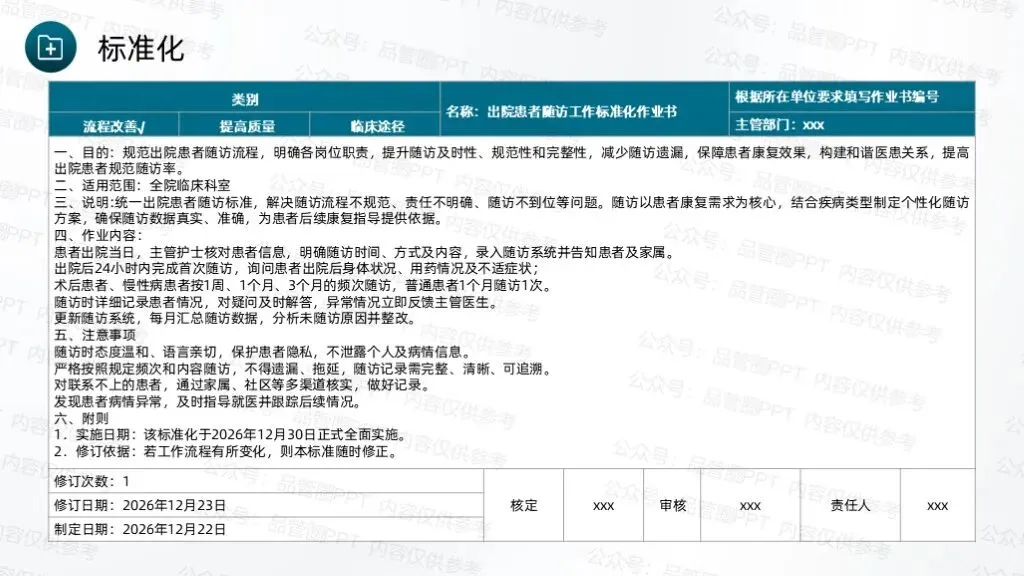 2. 明确患者住院期间的责任护士作为随访第一责任人,出院时由责任护士留存患者电话、微信双渠道联系方式,签订随访知情同意书,同步录入科室护理台账,确保责任到人。