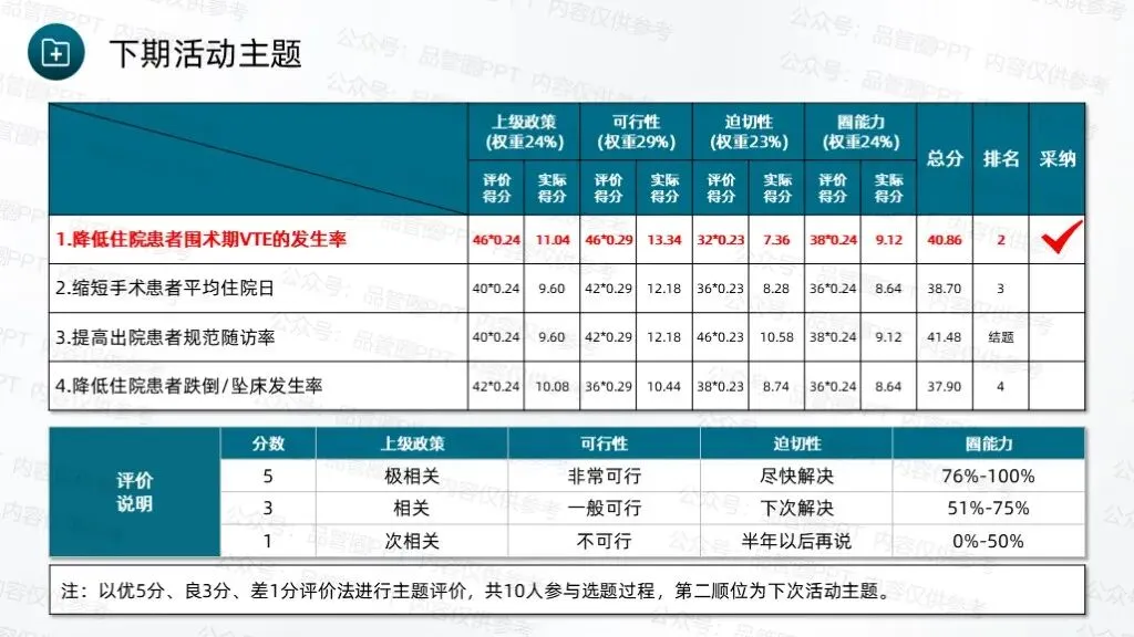 选题理由:住院患者围术期处于特殊的生理状态,身体机能受到手术创伤、麻醉、制动等多种因素影响,静脉血栓栓塞症(VTE)的发生风险显著增加。VTE 包括深静脉血栓形成(DVT)和肺血栓栓塞症(PTE),一旦发生,轻者可能导致肢体肿胀、疼痛、功能障碍,影响患者术后康复进程和生活质量;重者可能引发肺栓塞,导致呼吸困难、休克甚至猝死,严重威胁患者的生命安全。因此,降低住院患者围术期 VTE 的发生率,是保障患者围术期安全、促进患者快速康复、提高患者术后生活质量的迫切需求,具有重要的临床意义。