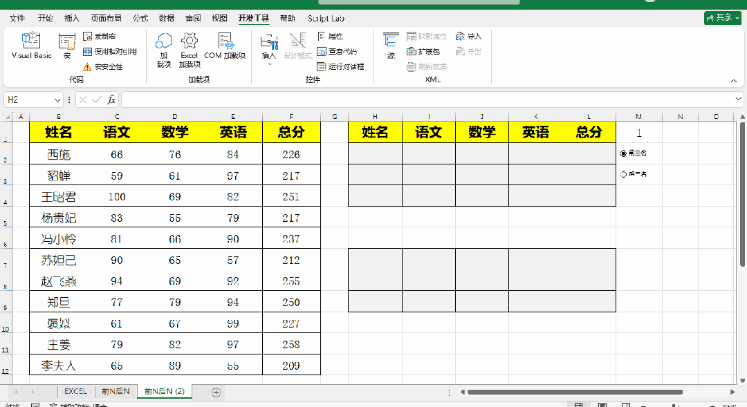 - 测试一下:点击“前三名”,单元格M1会显示“1”;点击“后三名”,M1会显示“2”——这一步是关键,公式会通过M1的值判断该显示哪组数据。
