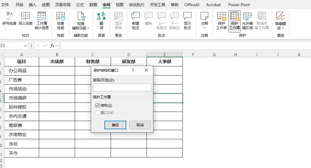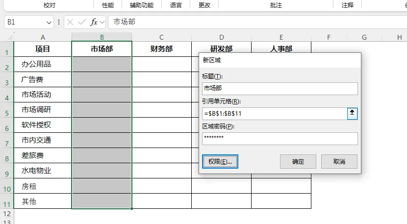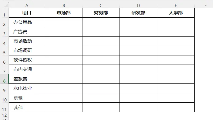 这里是一个预算表,财务部想让各部门进行统计,而且只允许各自部门只能填报自己的那列数据,表格如下: