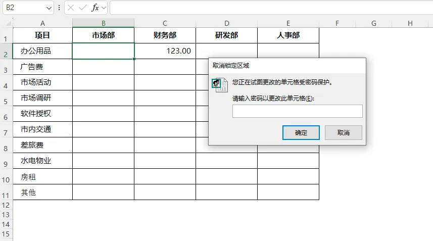 完成的效果将是这个样子,比如是财务部的同事,不小心点击了市场部单元格进行编辑,就会提示密码,以避免操作错误。